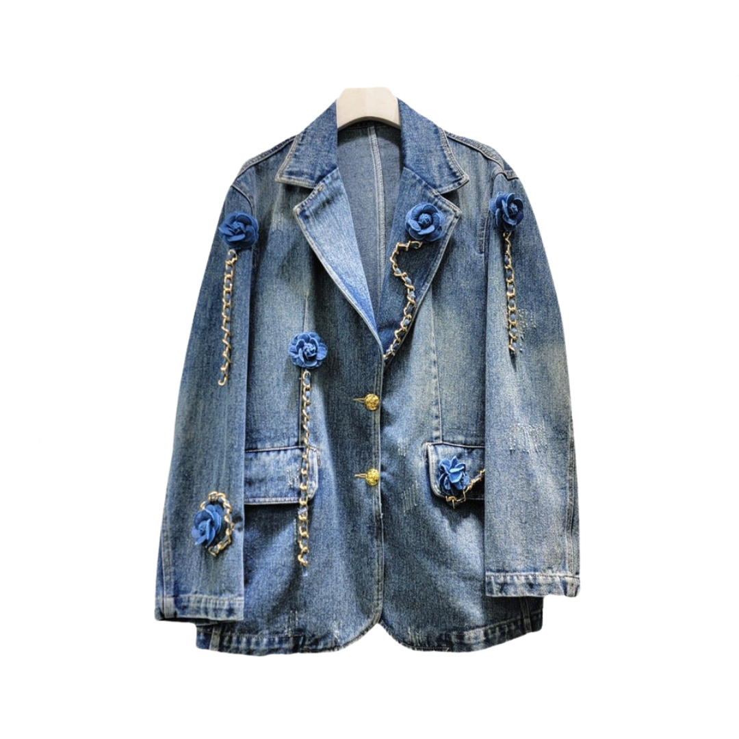 This 3D Flower Patchwork Gold Chain Washed Denim Jacket combines bold and intricate floral design with a touch of edgy gold chain accents. Crafted from washed denim. this jacket is both stylish and durable.