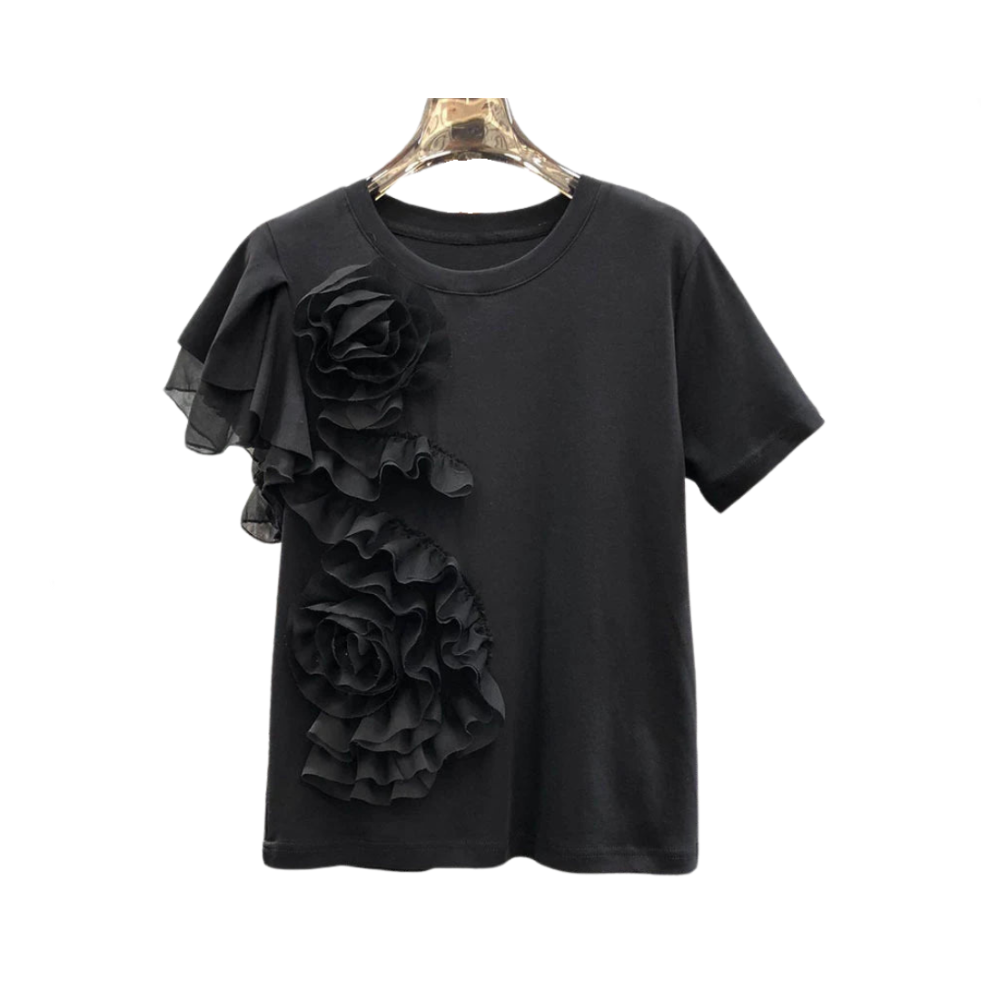 This 3D Flower Ruffled Edge Short Sleeve T-Shirt features a unique and eye-catching design. adding a touch of elegance and femininity to any outfit. The short sleeves provide comfort and breathability. while the ruffled edges add a playful yet sophisticated touch.