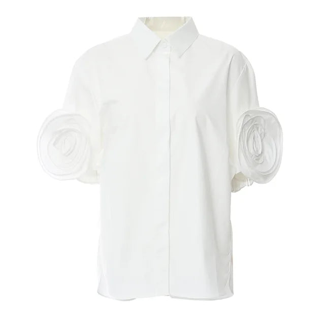 Introducing the 3D Flower Sleeve Shirt. a stunning piece that combines contemporary design with feminine flair. Featuring intricately crafted 3D flowers on the sleeves. this blouse will add a unique touch to any outfit.