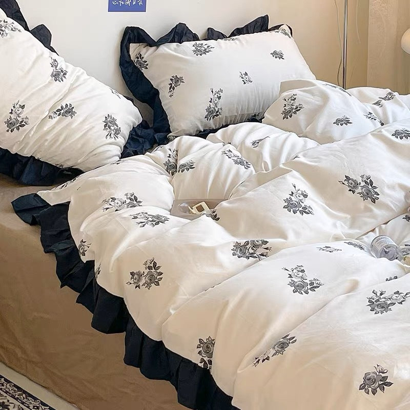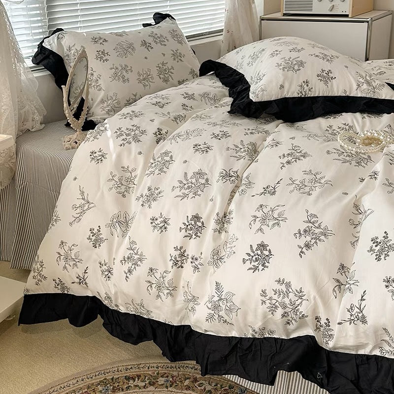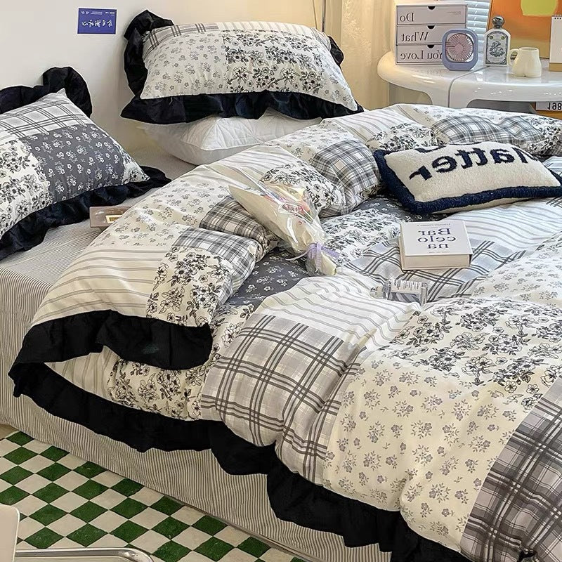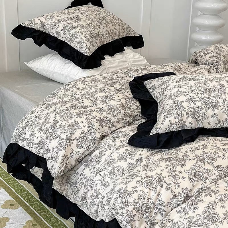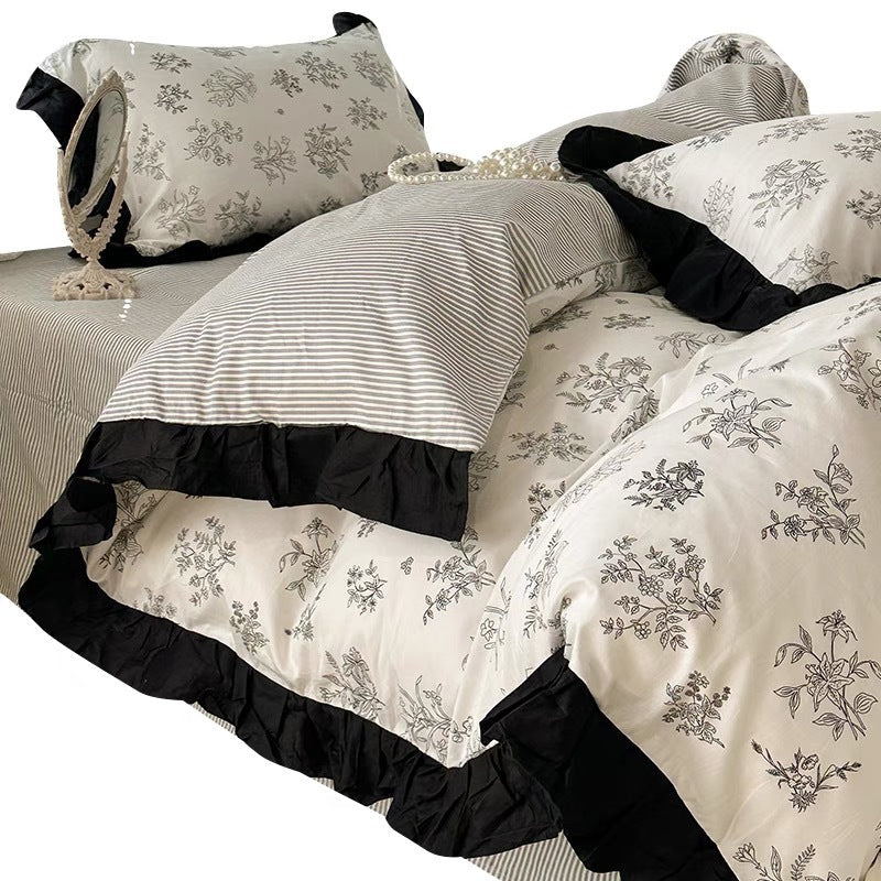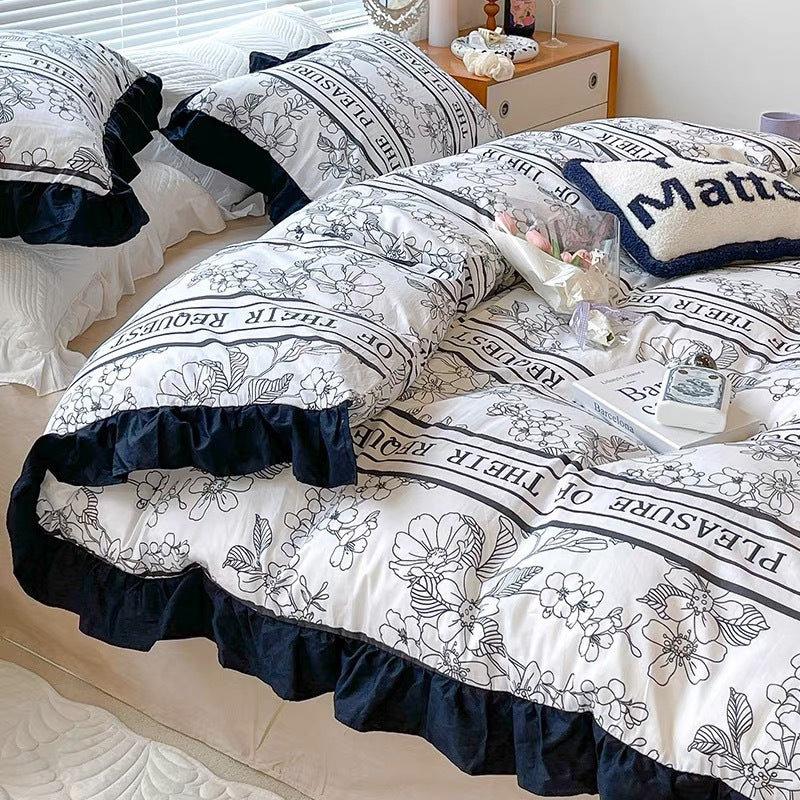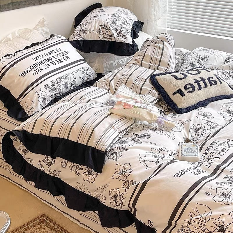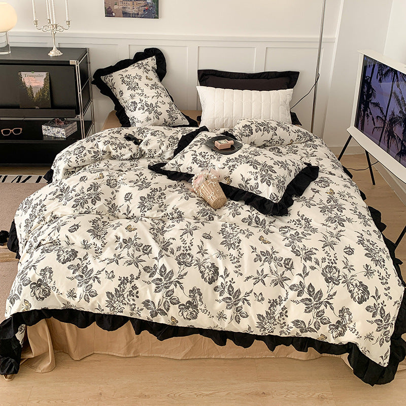 Cotton French retro bedding set four-piece set pure cotton Hepburn style bedding three-piece set black and white lace quilt cover