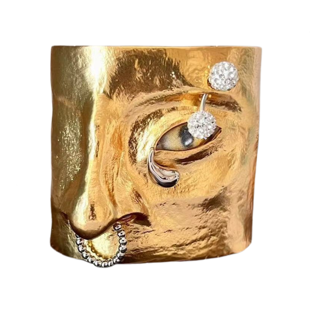 Crafted with a sleek. abstract design. this bracelet adds a touch of artistry to any outfit and makes a bold statement. Its open design allows for easy wear and its unique shape makes it a standout piece.