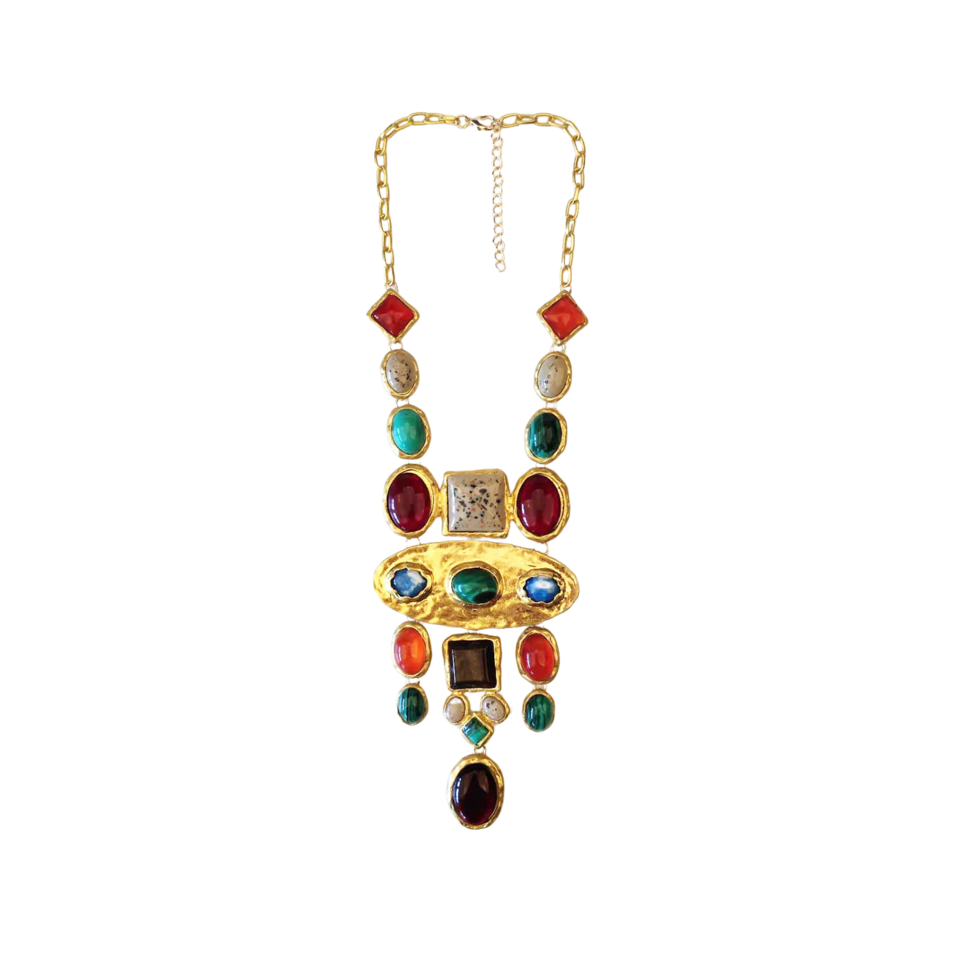 Handcrafted with unique and colorful baroque gemstones. it is a timeless piece that will elevate your style. Its geometric design and long length make it versatile for any occasion.