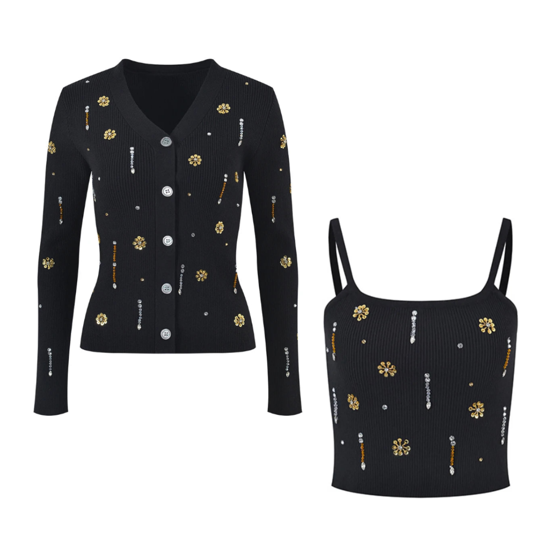 Upgrade your wardrobe with our elegant Beaded Floral Knitted Cardigan + Cami Set. The intricate beaded floral design adds a touch of sophistication to this comfortable and versatile set. Made with high-quality materials. this set is perfect for any occasion. Make a statement with this timeless and stylish addition to your closet.