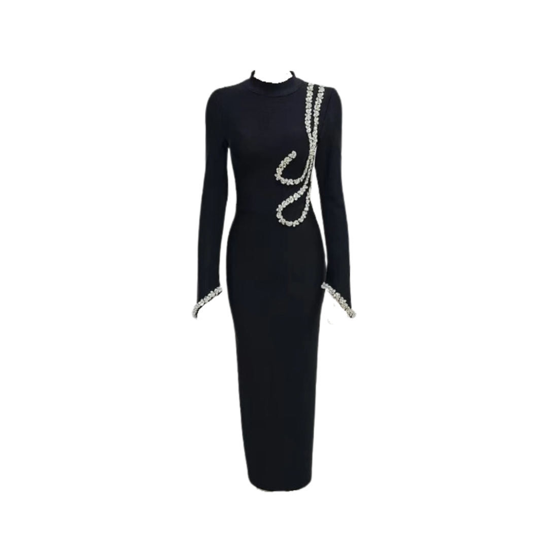 This black long sleeve dress is designed with a crystal bandage for a sleek and sophisticated look. The figure-hugging fit accentuates your curves and the long sleeves provide an added touch of elegance. Perfect for any formal occasion. this dress will make you stand out with its intricate detailing and flattering design.