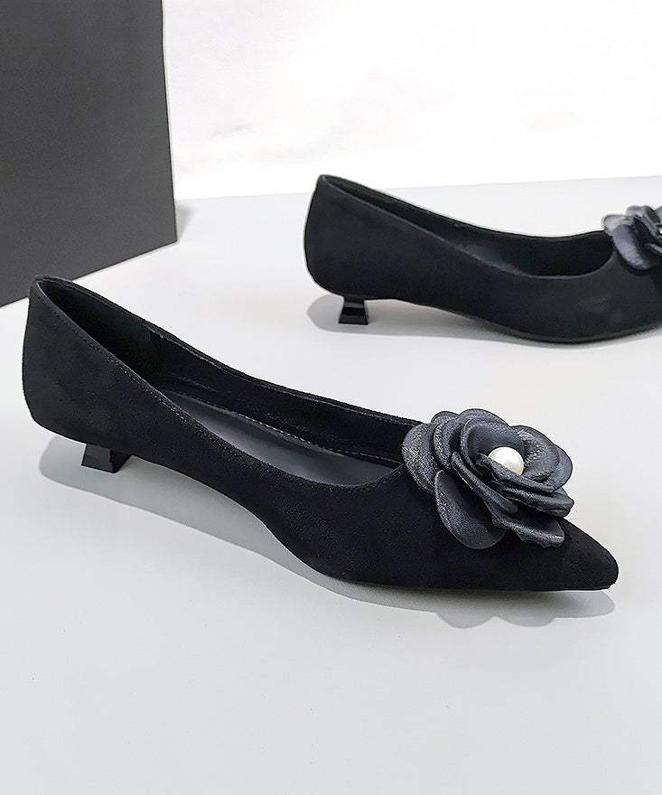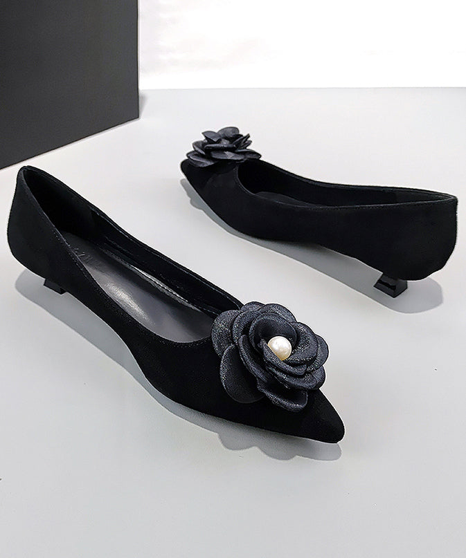 Black Suede Floral Splicing Kitten Shoes Pointed Toe