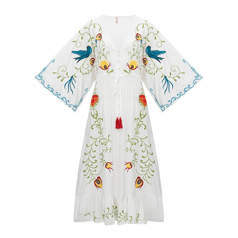 Bohemian flower embroidered long dress featuring a V-neckline and batwing sleeves. The tassel decorations making it perfect for any occasion.