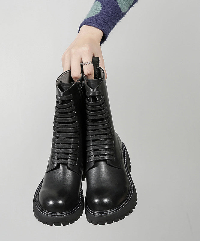 Boho Black Chunky Cowhide Leather Casual Cross Strap Boots