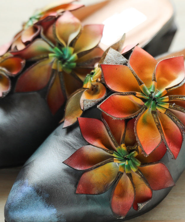 Boutique Chocolate Cowhide Leather Pointed Toe Slide Sandals Chunky Heel
