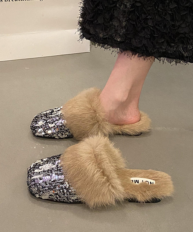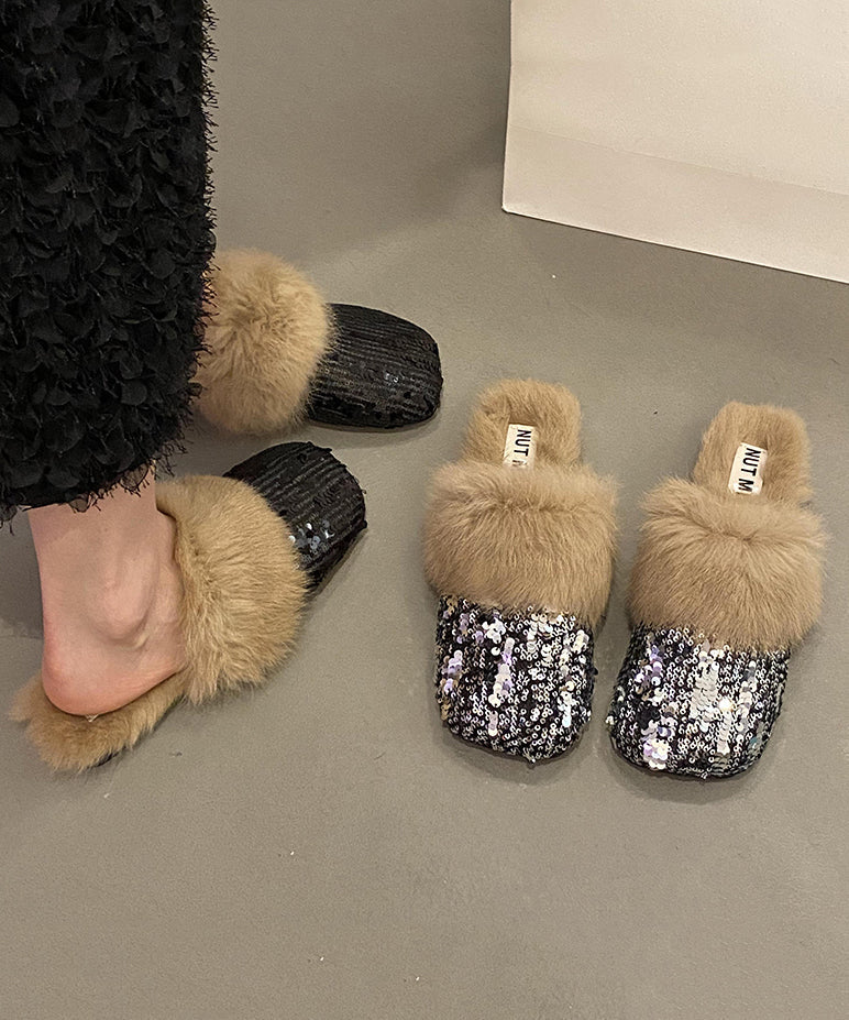 Boutique Fuzzy Wool Lined Splicing Slippers Shoes Black Sequins