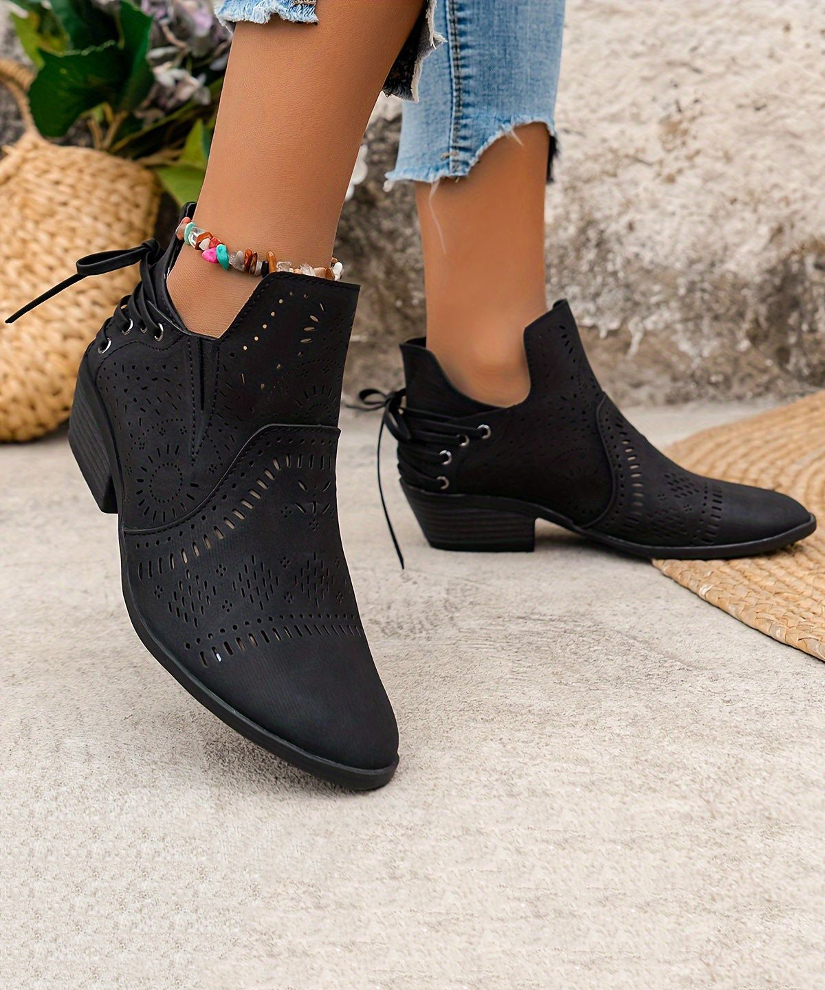 Brown Boots Chunky Faux Leather Solid Hollow Out Ankle Boots
