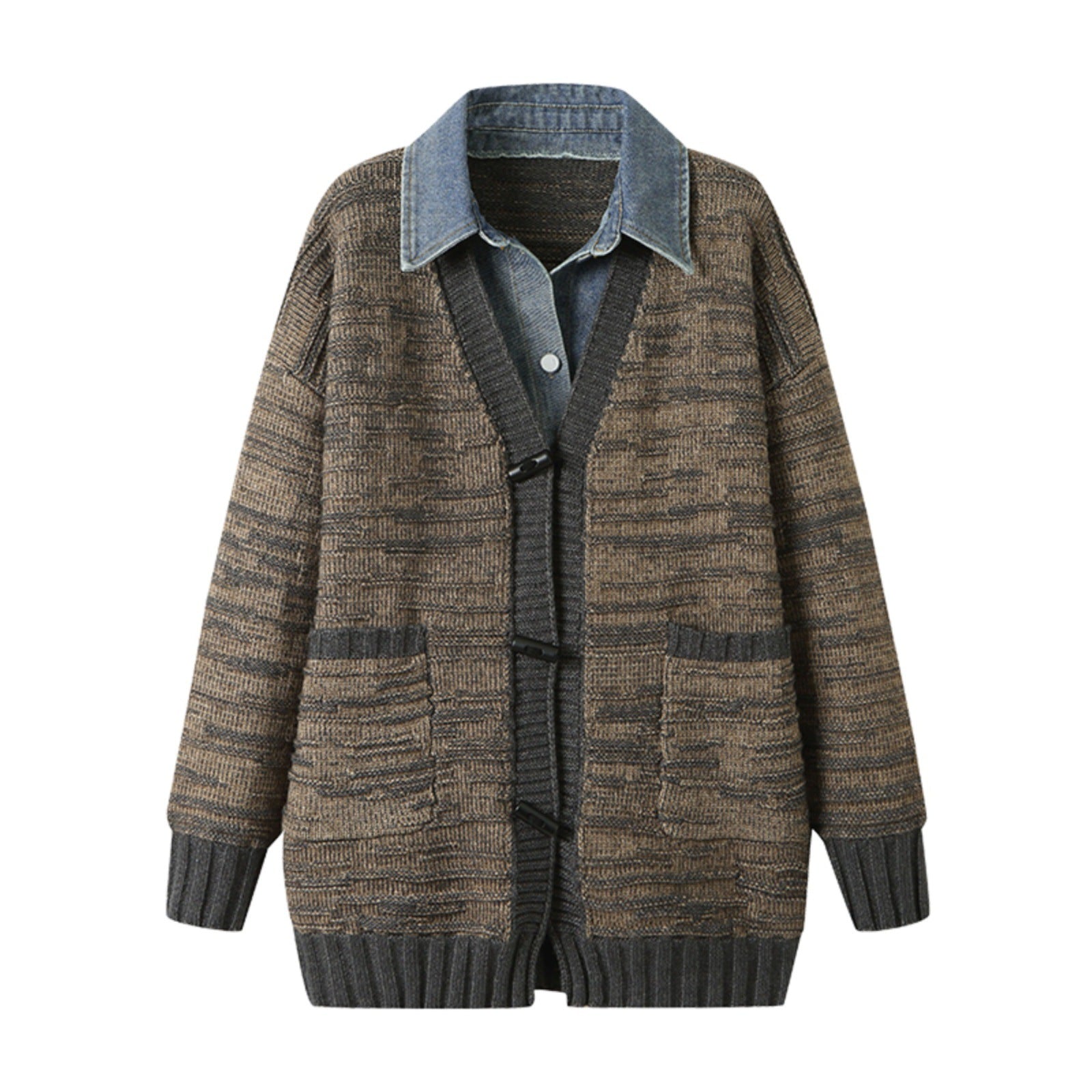 Experience the ultimate in autumn fashion with our Brown Knitted Patchwork Denim Cardigan Sweater. Made for the modern woman. this stylish sweater coat features a unique patchwork design in denim. giving the illusion of a two-piece outfit. The loose. stretchy knit and long sleeves provide both comfort and style. Upgrade your wardrobe today with this must-have addition!