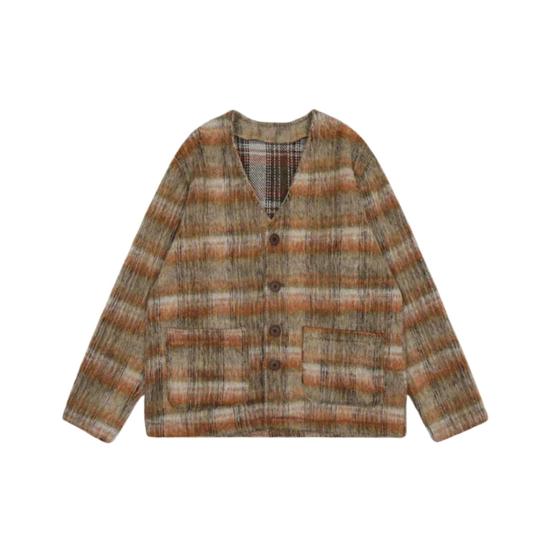 This cardigan is made from soft mohair fabric. creating a cozy and stylish look. The brown plaid design adds a touch of sophistication. making it a versatile addition to any wardrobe.