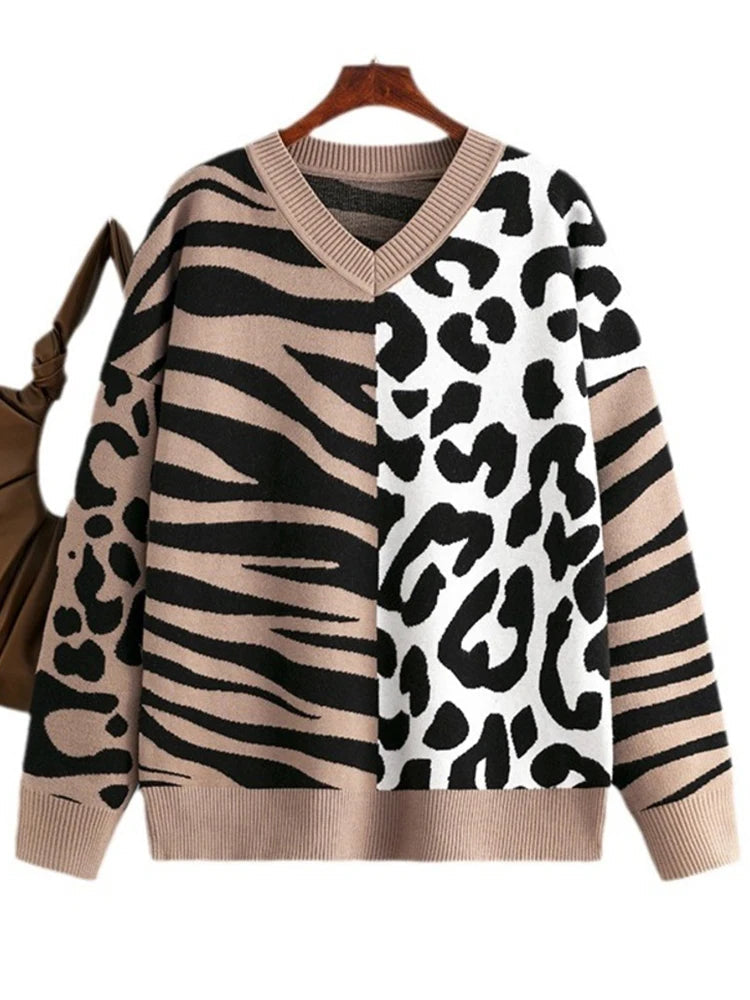Crafted with a trendy leopard print and color block design. this V-neck pullover top adds a touch of wild to your wardrobe. Made with high-quality materials. our sweater ensures comfort and warmth.