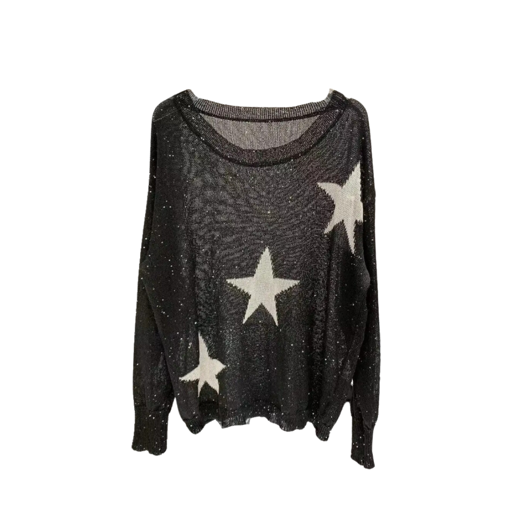Our Casual Geometric Sequins and Stars Knitted Sweater is made with high-quality materials. this O-neck pullover will keep you warm and on-trend. Perfect for any casual occasion. the loose fit and long sleeves add a touch of comfort to your wardrobe.