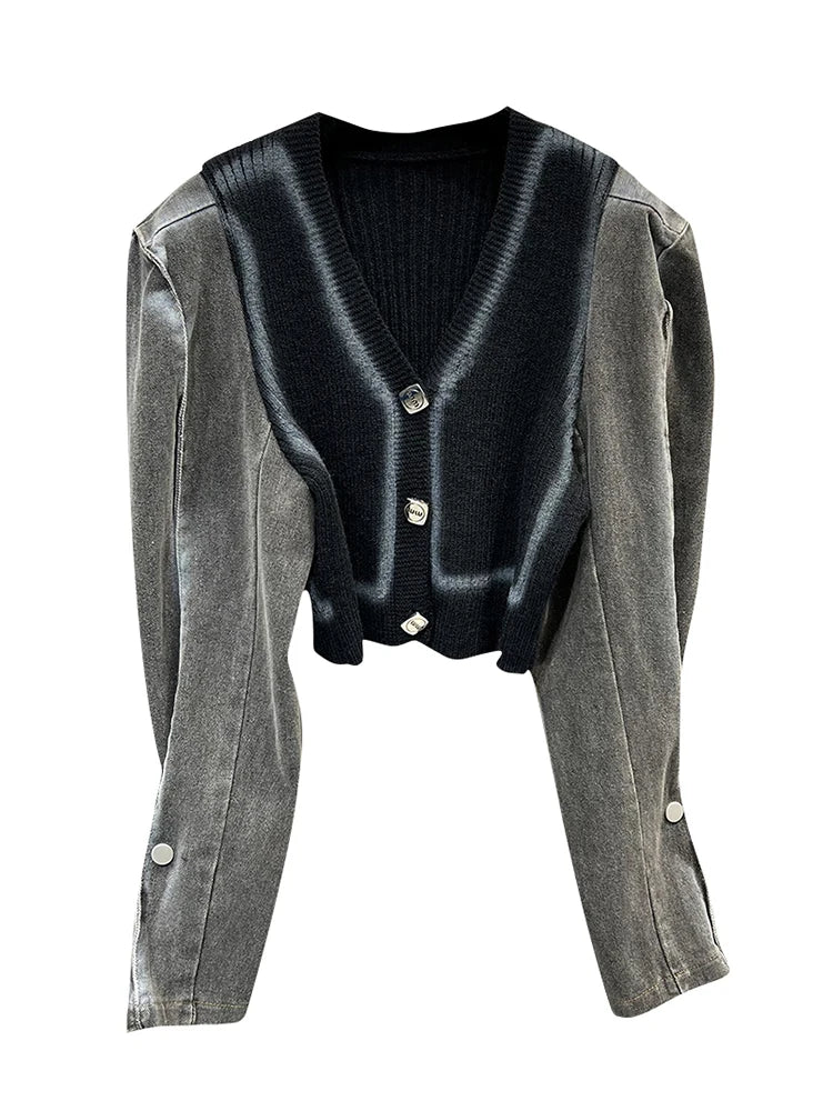 Made with a knit body and denim long sleeves. this cardigan not only provides warmth but also adds a touch of contrast to your outfit.