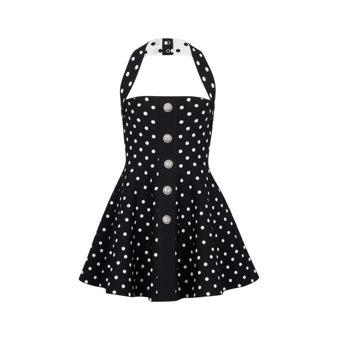 Expertly crafted with a polka dot jacquard pattern. this halterneck dress combines style and comfort for a casual yet chic look. The halterneck design offers a flattering silhouette. making it perfect for any occasion.