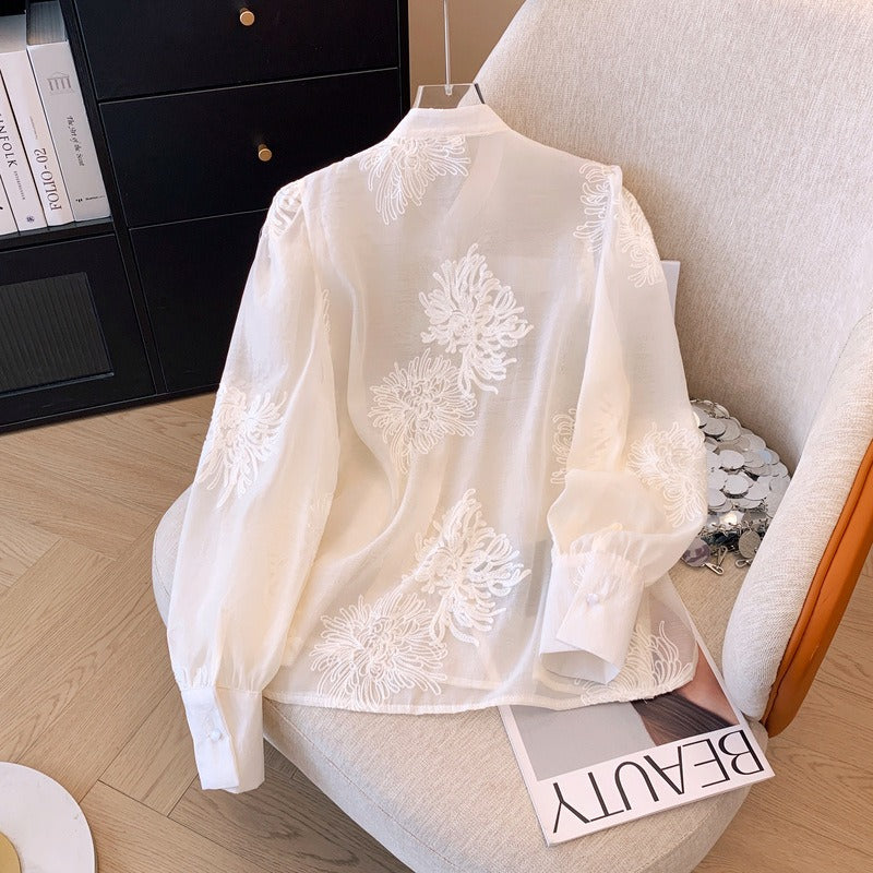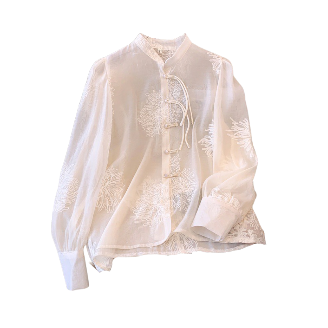 Made with chiffon fabric and adorned with delicate embroidery. this shirt is perfect for any casual occasion. The disc-button closure adds a touch of uniqueness and functionality.