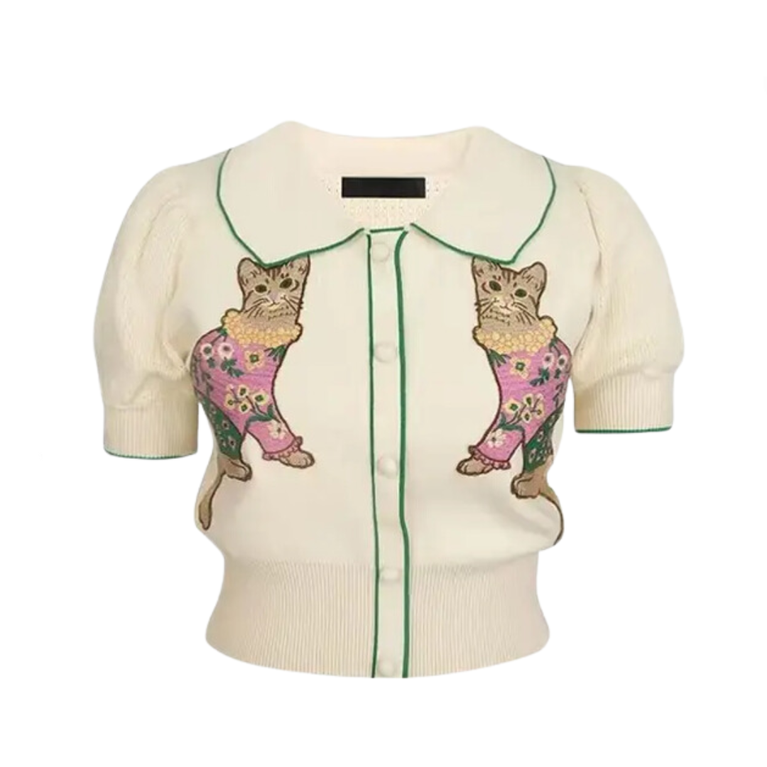 The intricate cat embroidery adds a touch of whimsy to the classic short sleeve design. Made with a comfortable and durable knit fabric. this t-shirt is perfect for everyday wear.