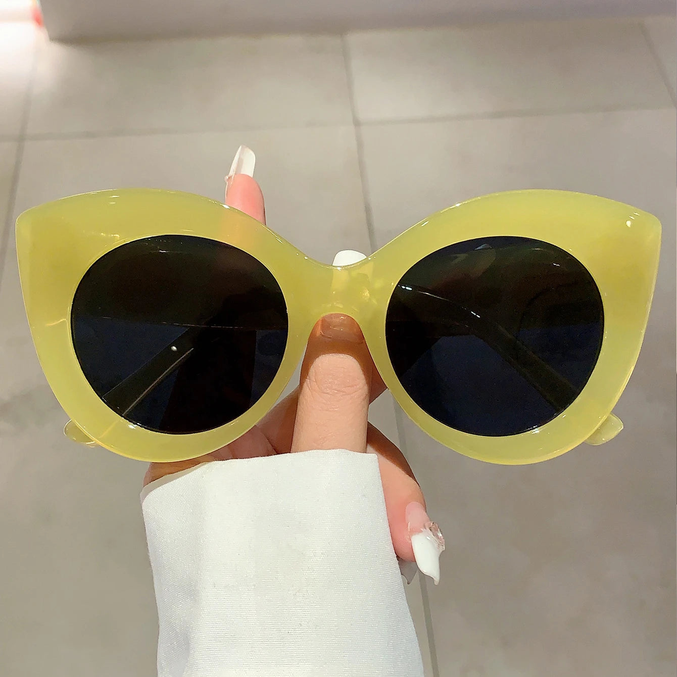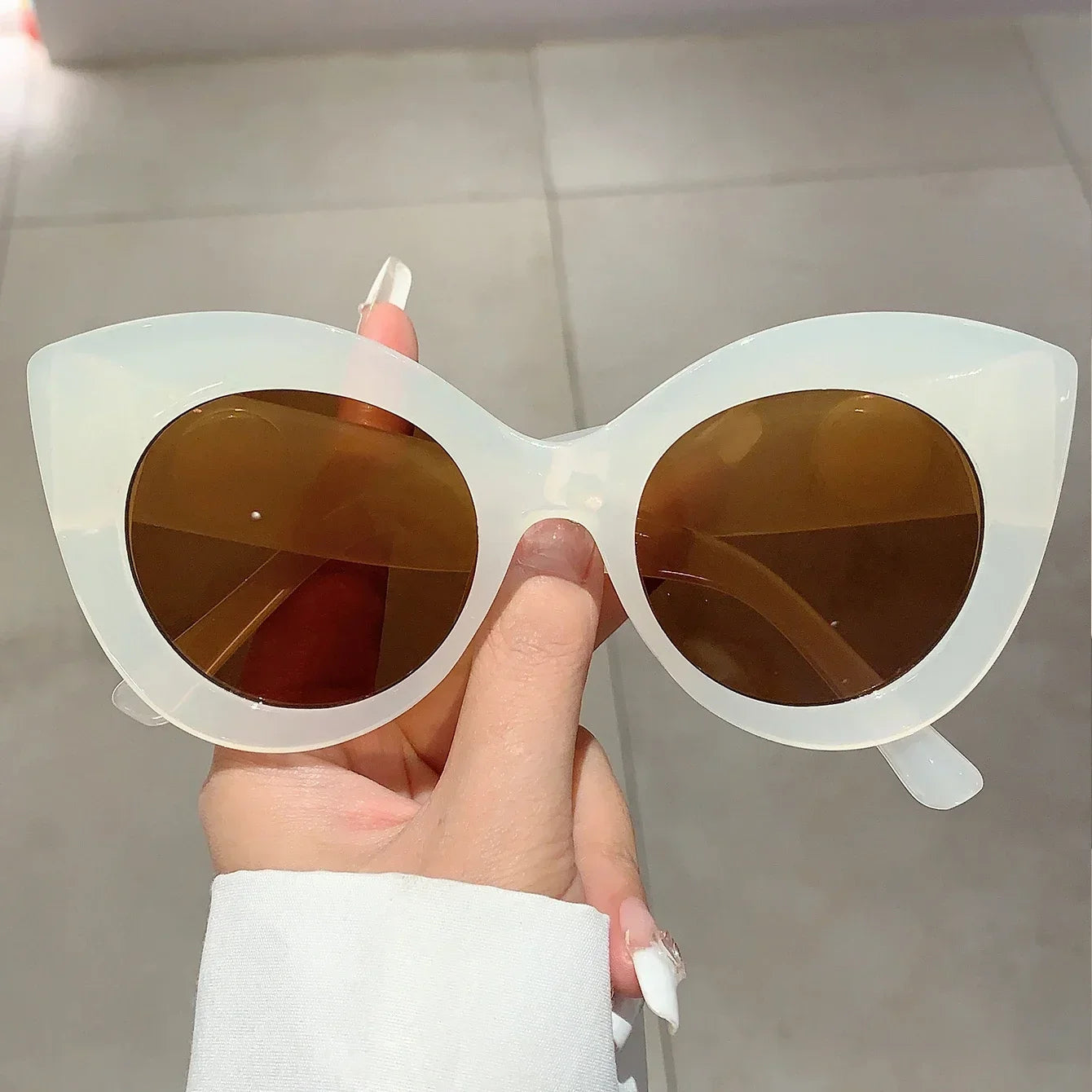 With their candy pearl color and oversized frame. they offer 100% UV protection while making a statement. The cat's eye design adds a touch of retro flair. making these sunglasses a perfect choice for any fashion-forward individual.