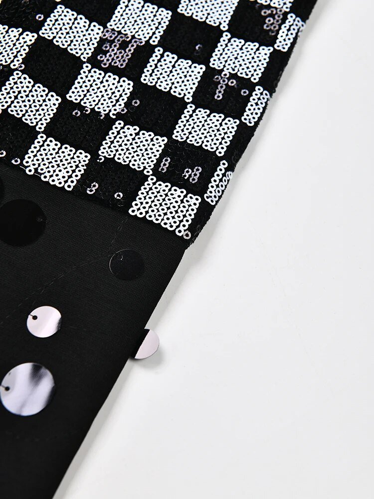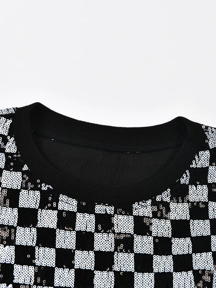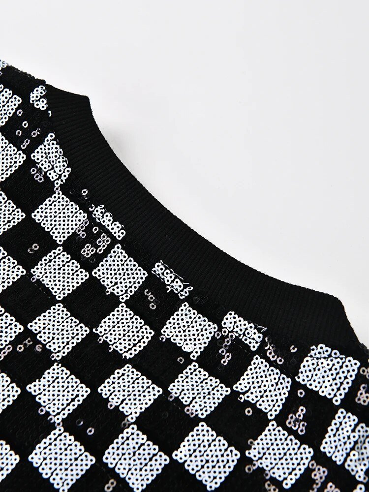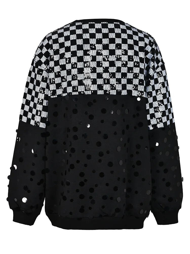 Loose Fit Black Plaid Sequins Sweatshirt New Round Neck Long Sleeve Women