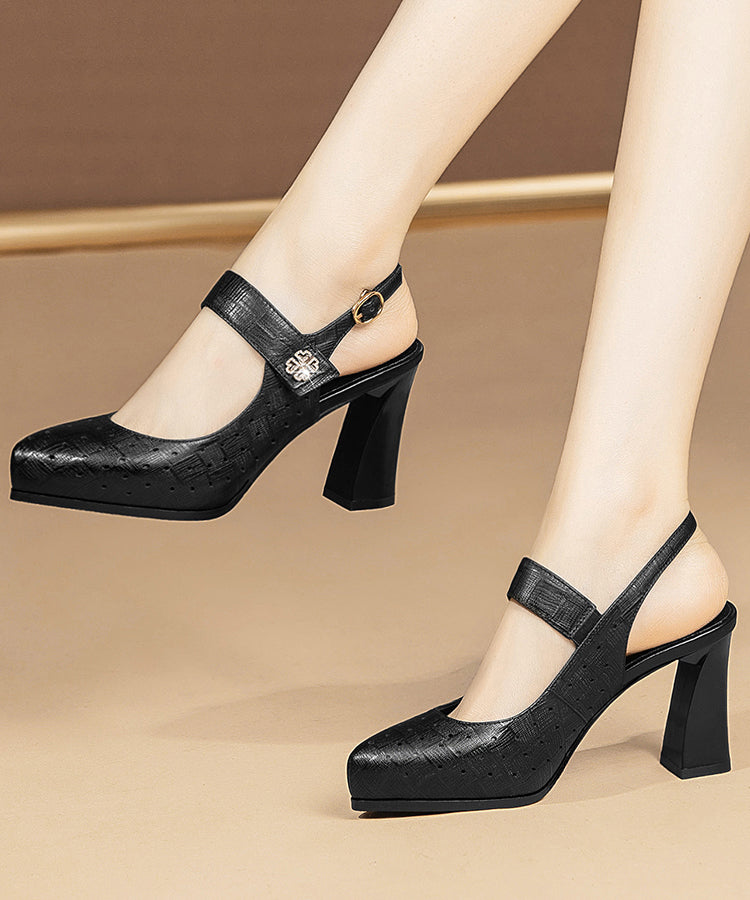 Chic Beige Chunky Heel Cowhide Leather Hollow Out SandalsMade of:-Cowhide Leather Upper.-Rubber sole- cushioned insole.2.75"/7cm Chunky Heel