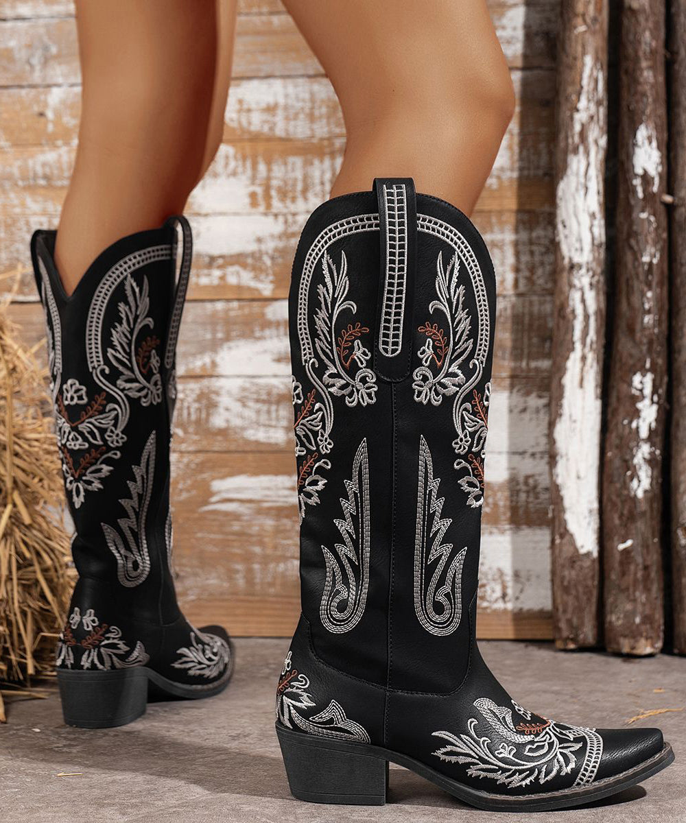 Chic Black Splicing Faux Leather Chunky Boots Embossed