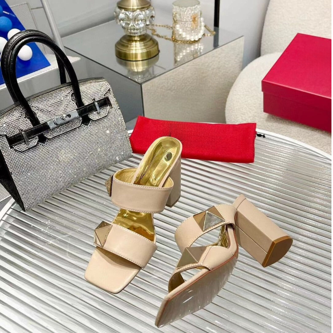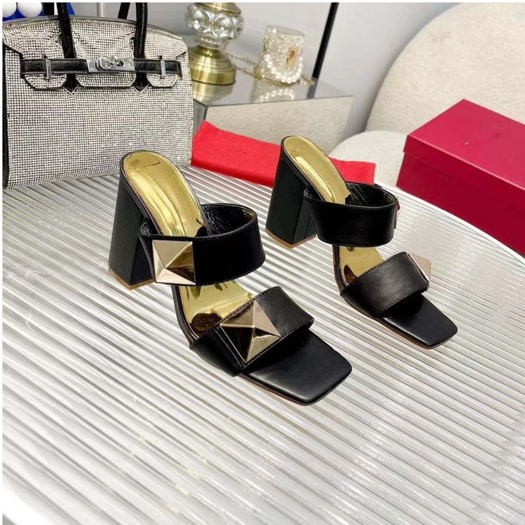 These sandals feature a sturdy chunky heel and a sleek one-line strap decorated with rivets. Perfect for adding a touch of edgy sophistication to any outfit.