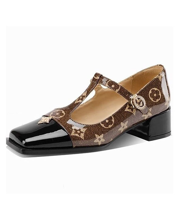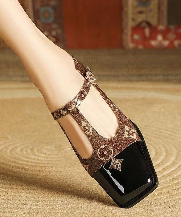 Coffee Buckle Strap Print Splicing Faux Leather Chunky Sandals