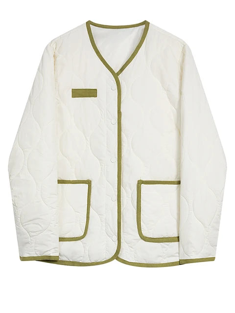 Stay warm and stylish this season with our versatile Cotton-Padded V-Neck Long Sleeve Parkas Jacket. Featuring a white and violet color. big pockets. and a loose fit. this coat is perfect for autumn and winter. Made with warm. soft cotton. it's both fashionable and practical.