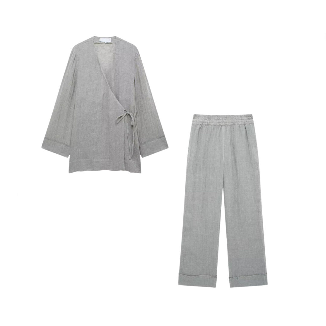 Designed with comfort in mind. this set features a drawstring wrap top and matching pants for ultimate coziness. Made with soft fabric and a flattering fit. this set is perfect for lounging or running errands.