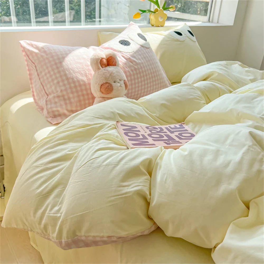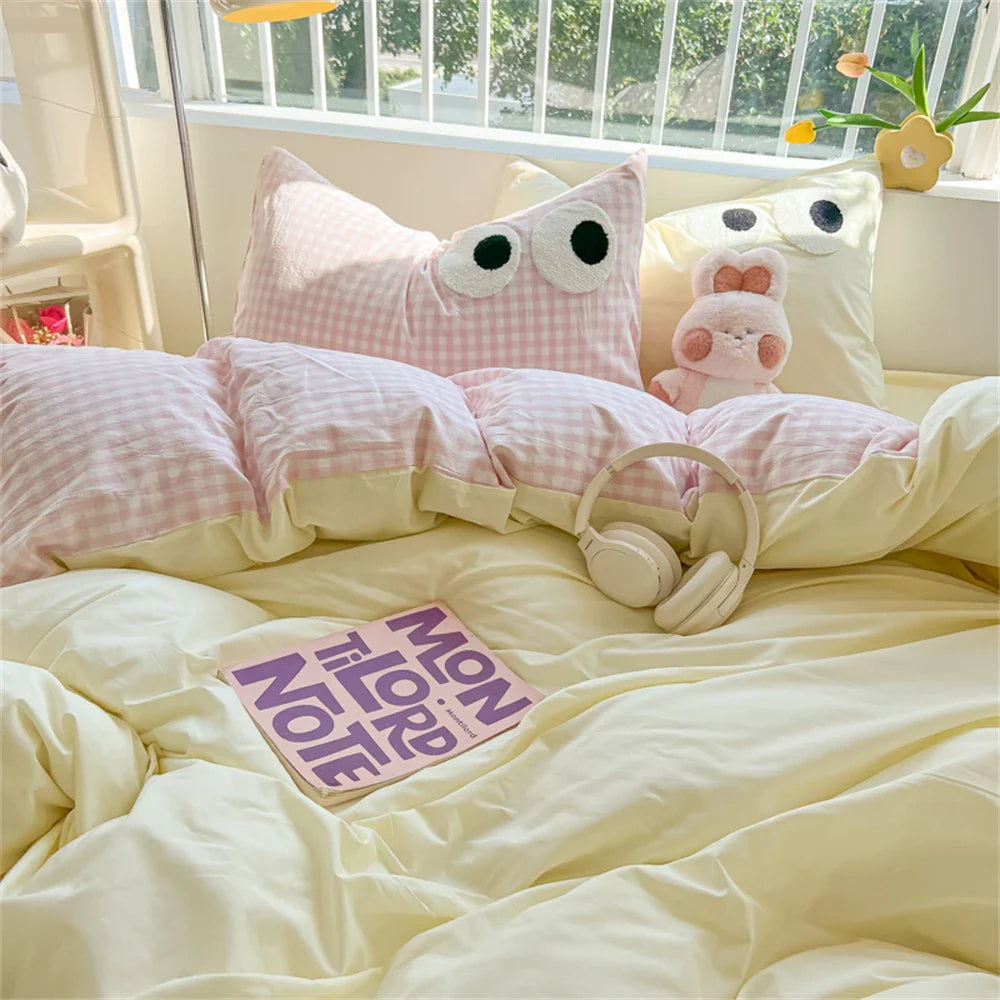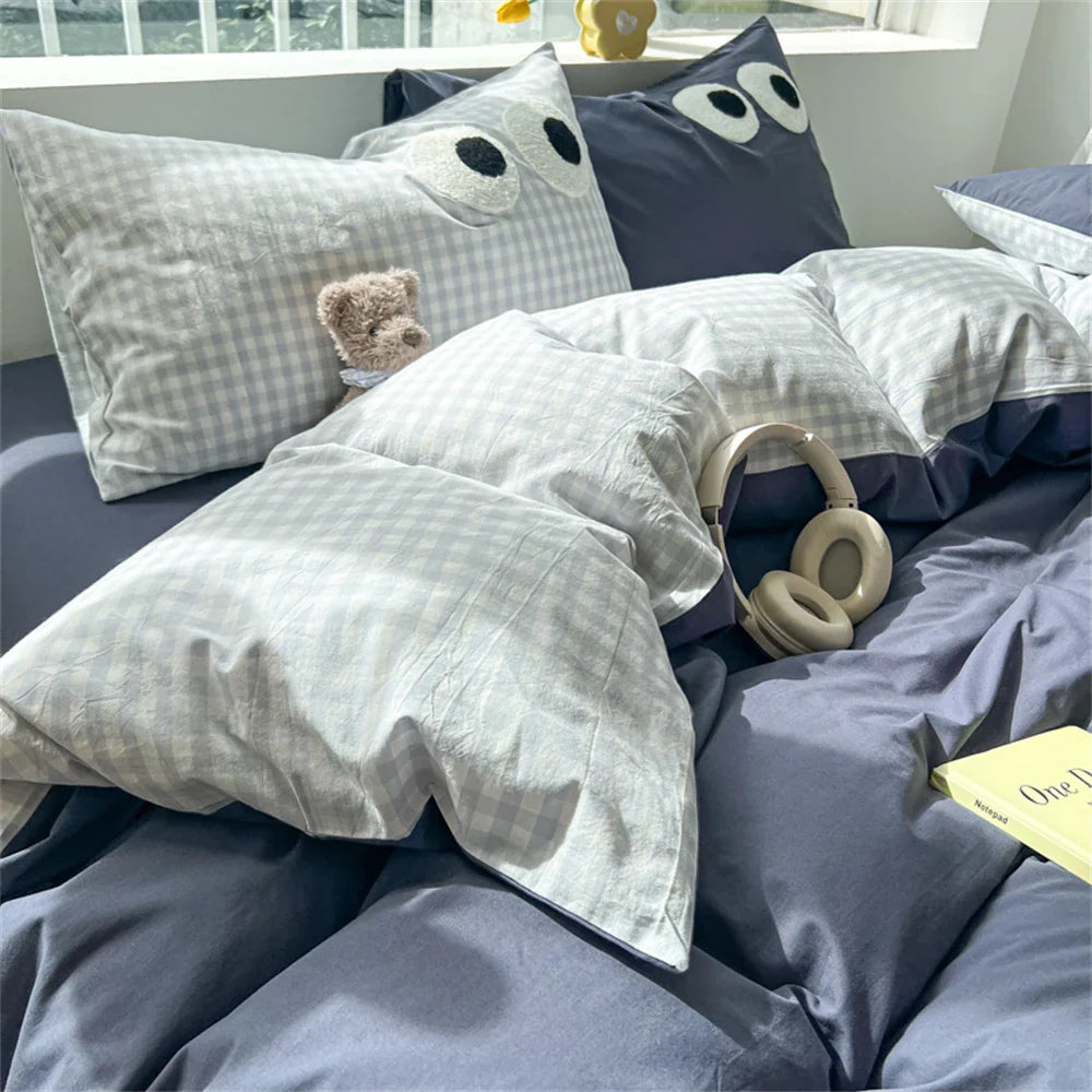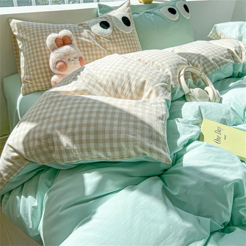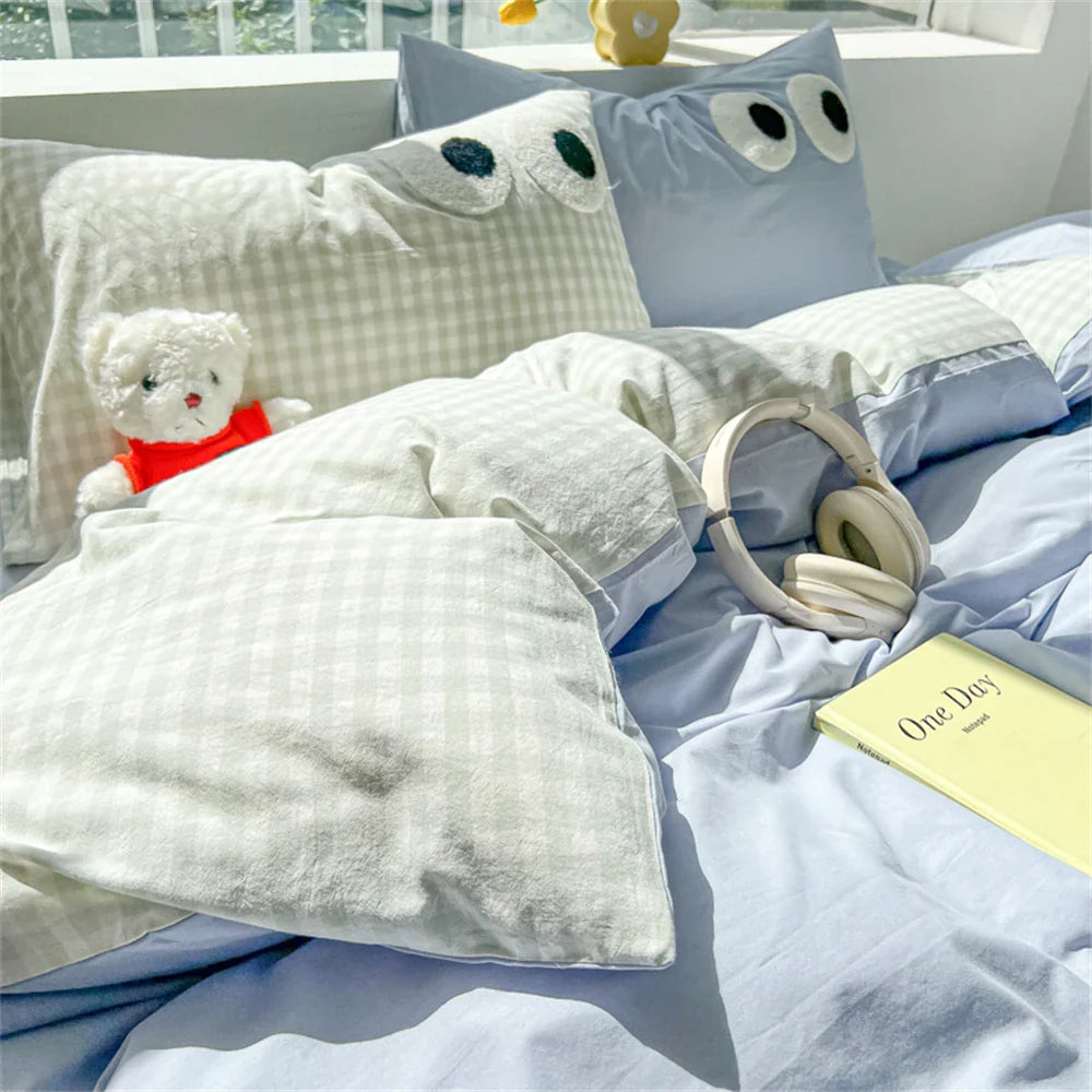 Cute Big Eyed Four Piece Set Plaid Duvet Cover Set With Sheet Bedroom Decor Skin Friendly Single Double Bedding Set Home Textile