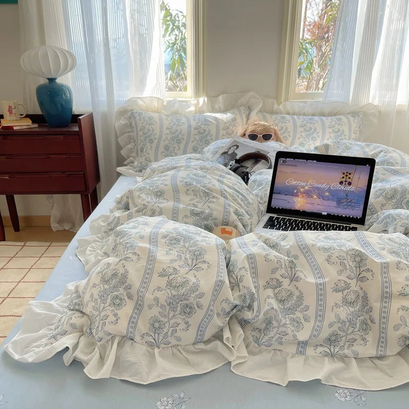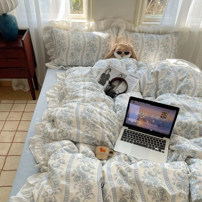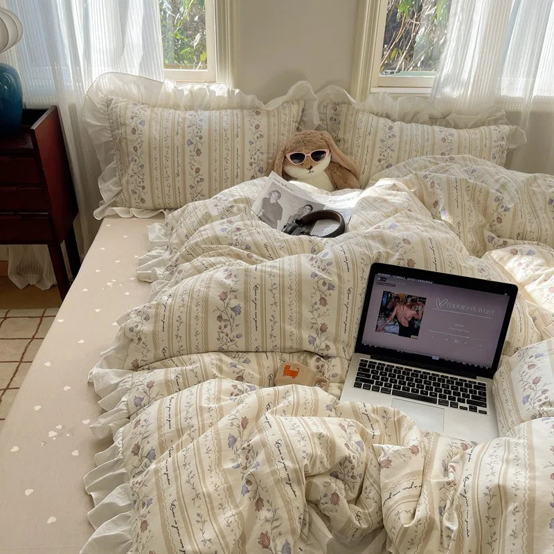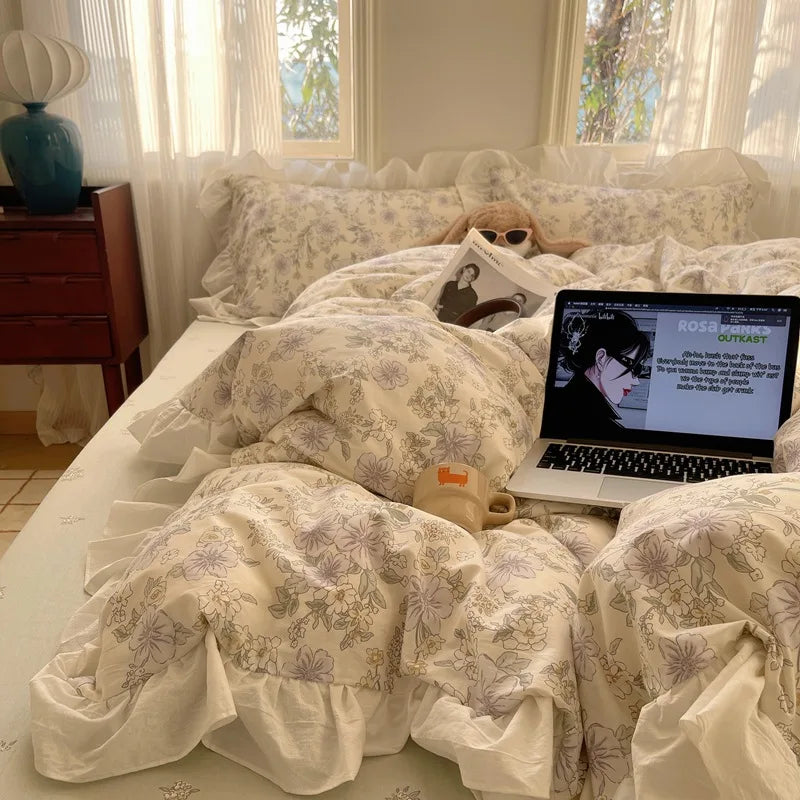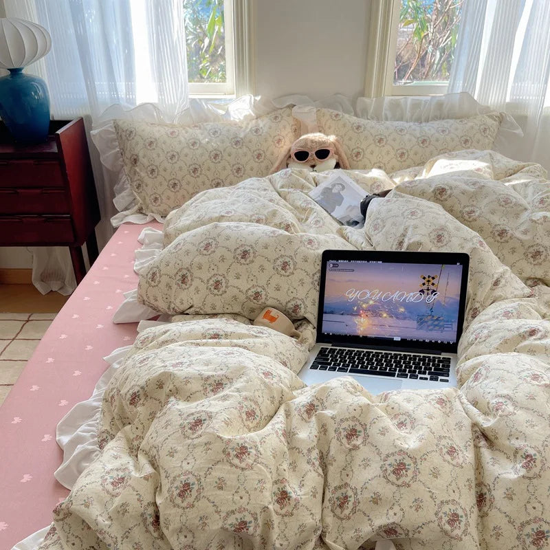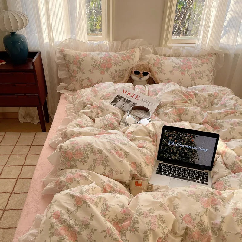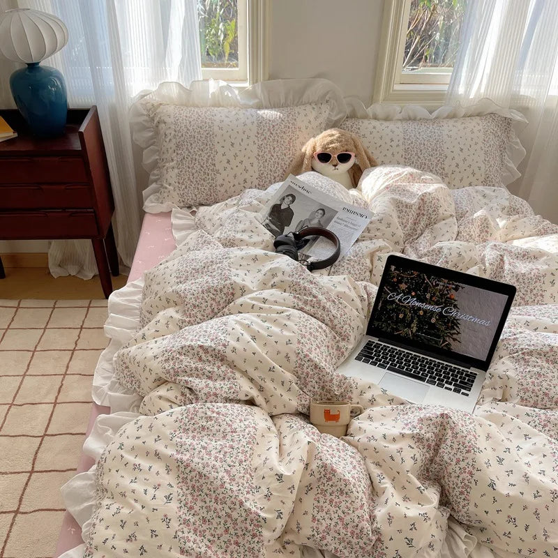 Cute Flower Korean Duvet Cover Bedding Set Pink Cotton Kawaii Double Bed Fitted Bed Sheets Quilt Cover Set Queen Twin Full Size