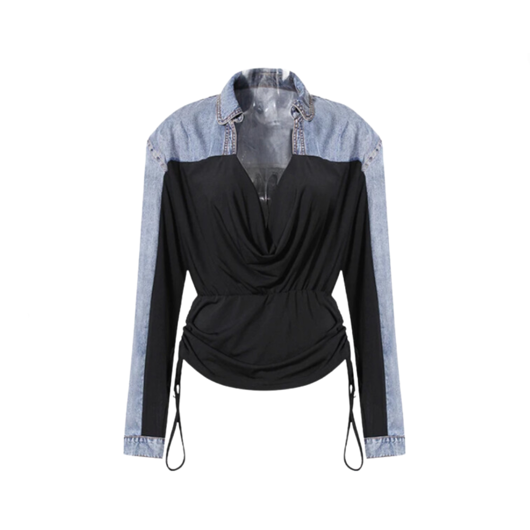 Upgrade your blouse collection with our Denim Drawstring Pleated V-Neck Long Sleeve Shirt. Its v-neckline and pleated design give you a polished and sophisticated look. while the drawstring waist allows for a customizable fit.