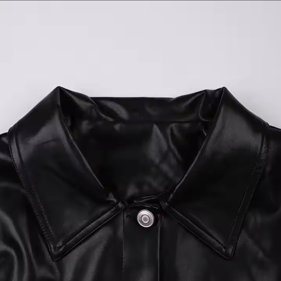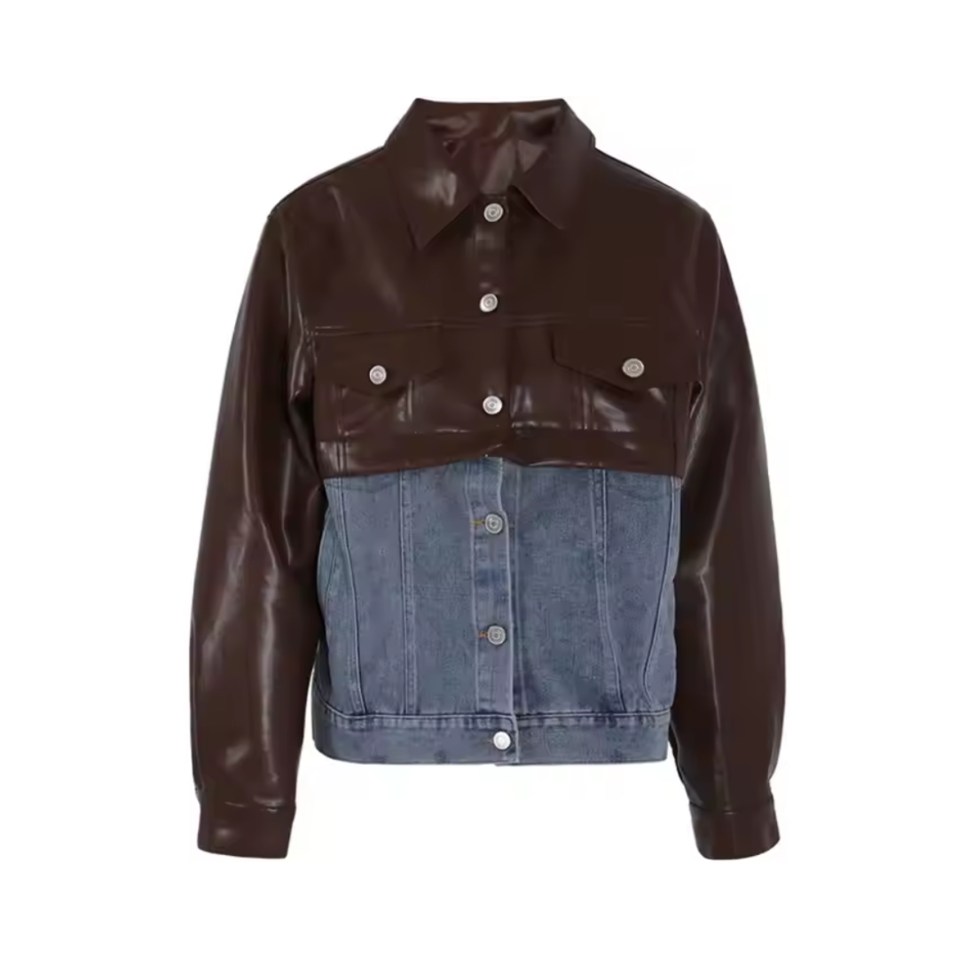 Made with PU leather and detachable denim panels. it can be worn as a cropped jacket or full-length coat. Its unique design provides both warmth and a trendy appearance. making it a must-have for any fashion-forward wardrobe.
