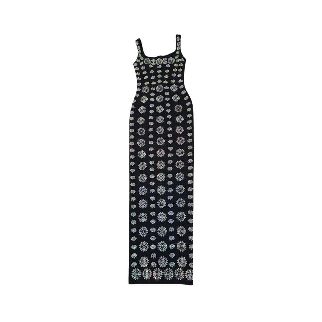 Expertly designed with diamond embellishments. this hip-wrapped bandage maxi dress is the epitome of sophistication. The intricate detailing adds a touch of elegance to this form-fitting dress. making it the perfect choice for any formal event.