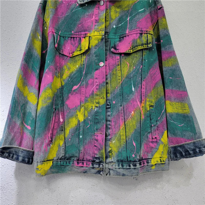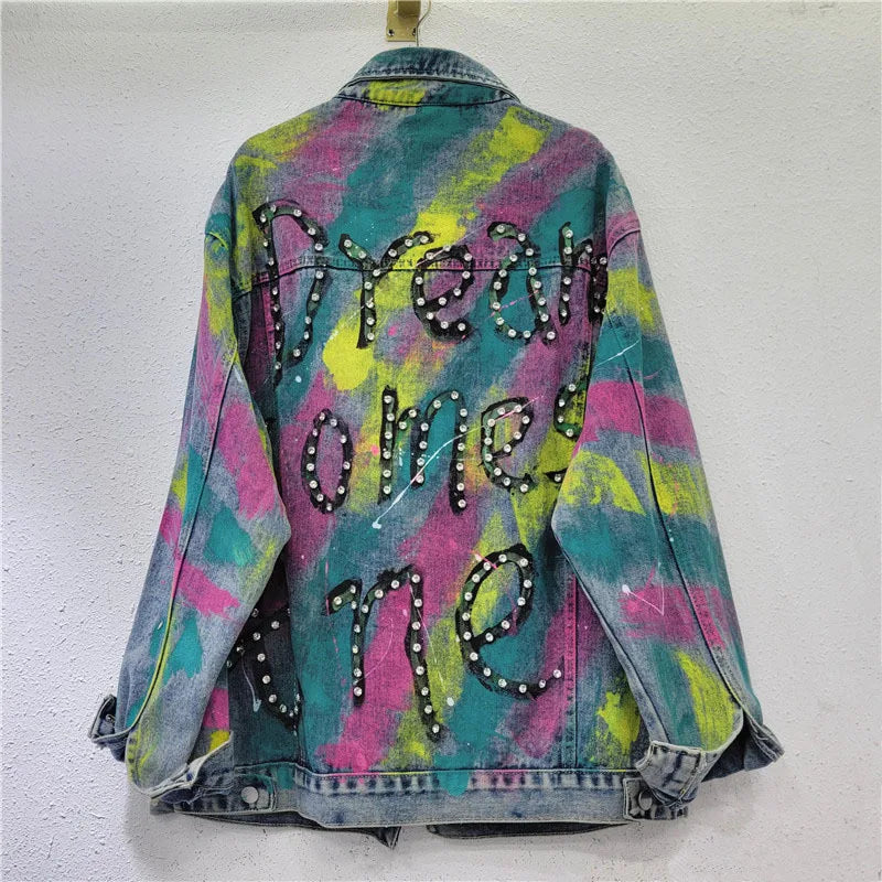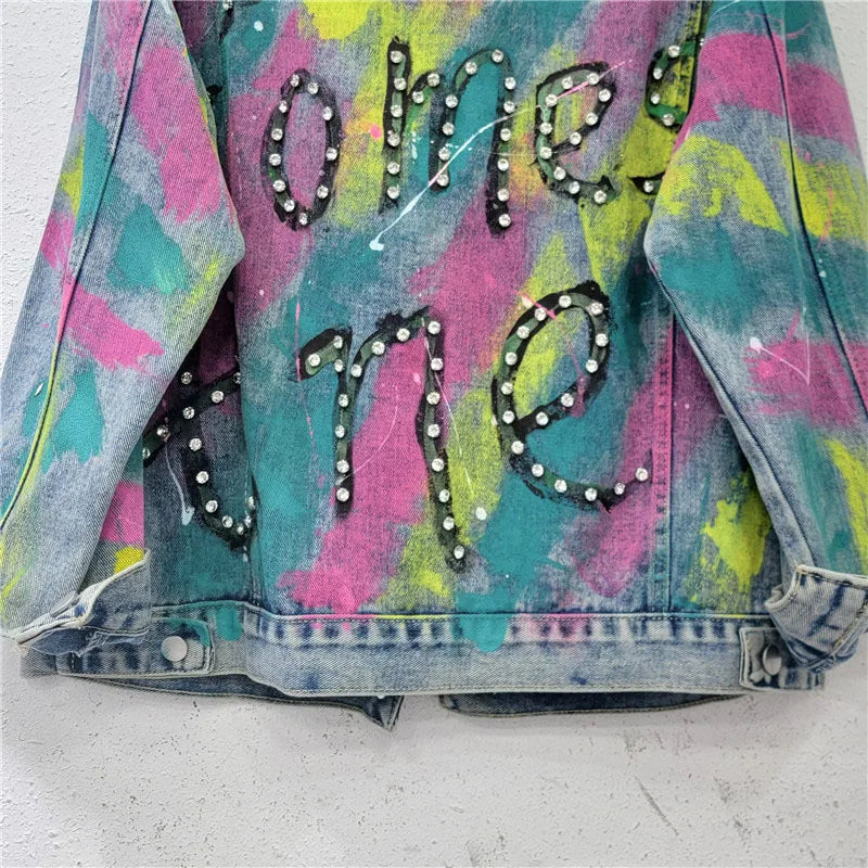 This Diamond Inlaid Letter Spray Painted Denim Jacket is an edgy and luxurious addition to any wardrobe. With its diamond inlay design and spray painted letter details. it guarantees to make a stylish statement.