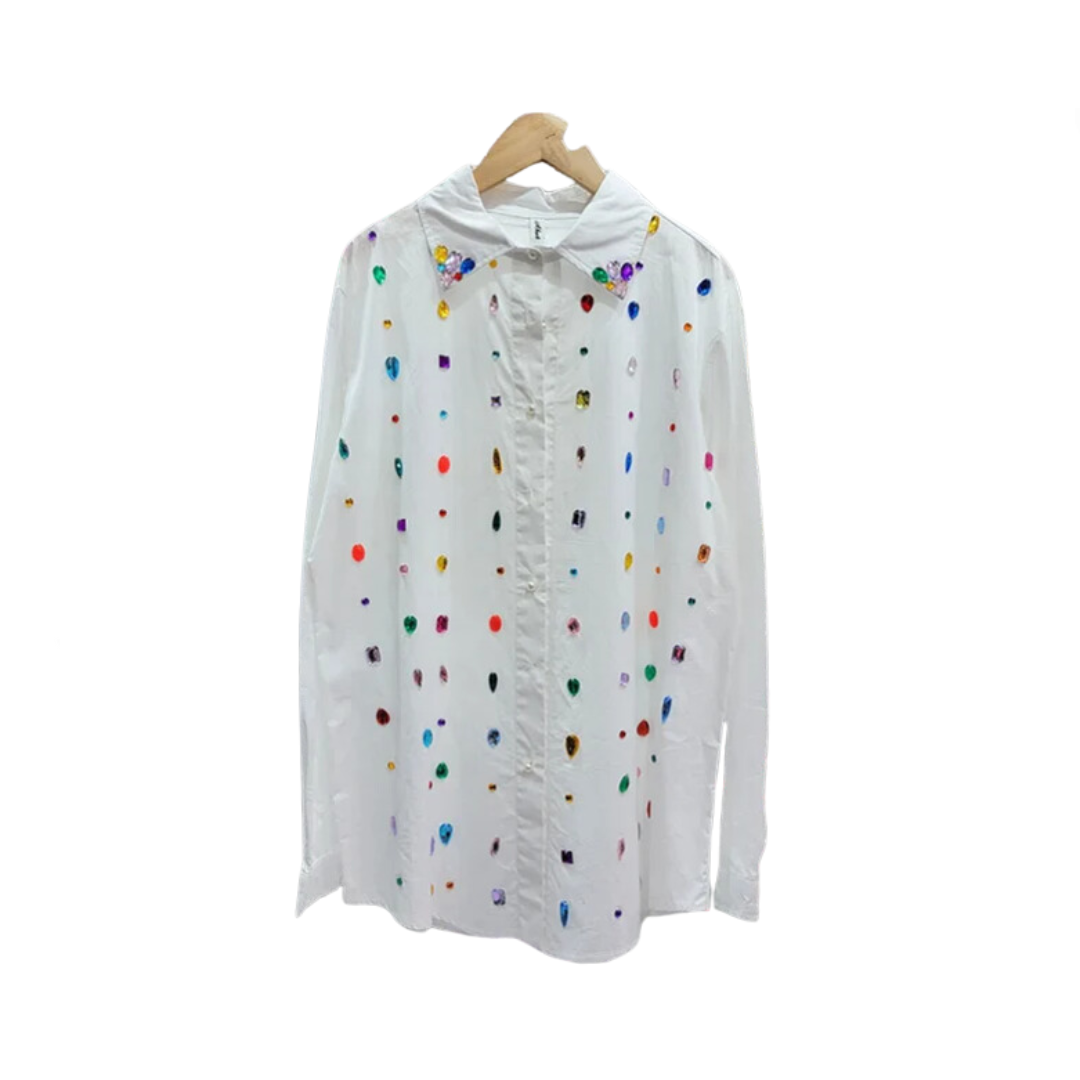 Expertly crafted with a loose fit and long sleeves. this Diamond Inlaid shirt offers both style and comfort. The diamond inlay adds a touch of sophistication. making it perfect for any occasion.