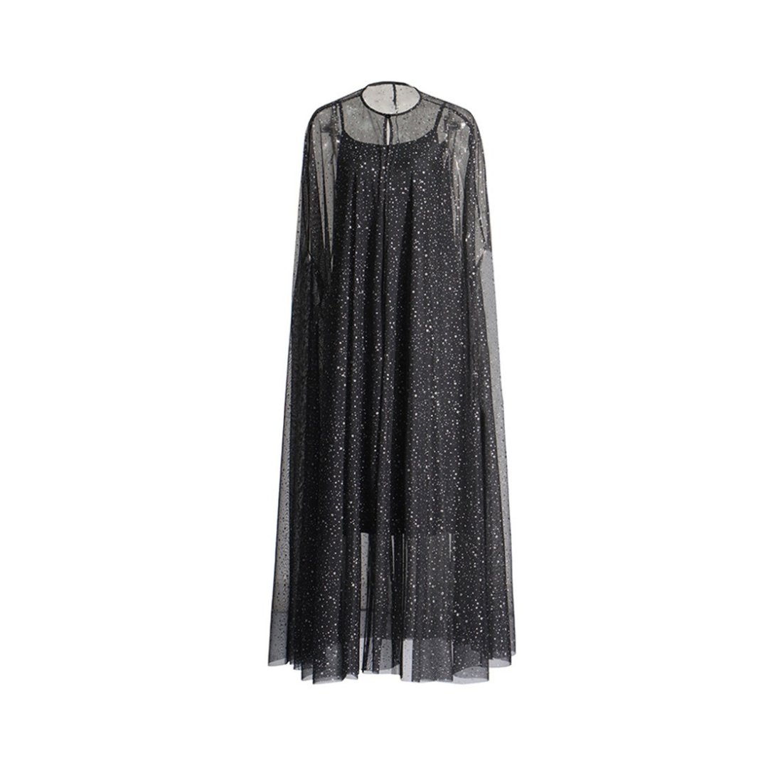 Elevate your style with our Diamond Mesh Cloak + Black Satin Dress Set. The elegant cloak is adorned with shimmering diamond mesh. while the sleek black satin dress exudes sophistication. Perfect for any special occasion. this set will make you stand out in a crowd.