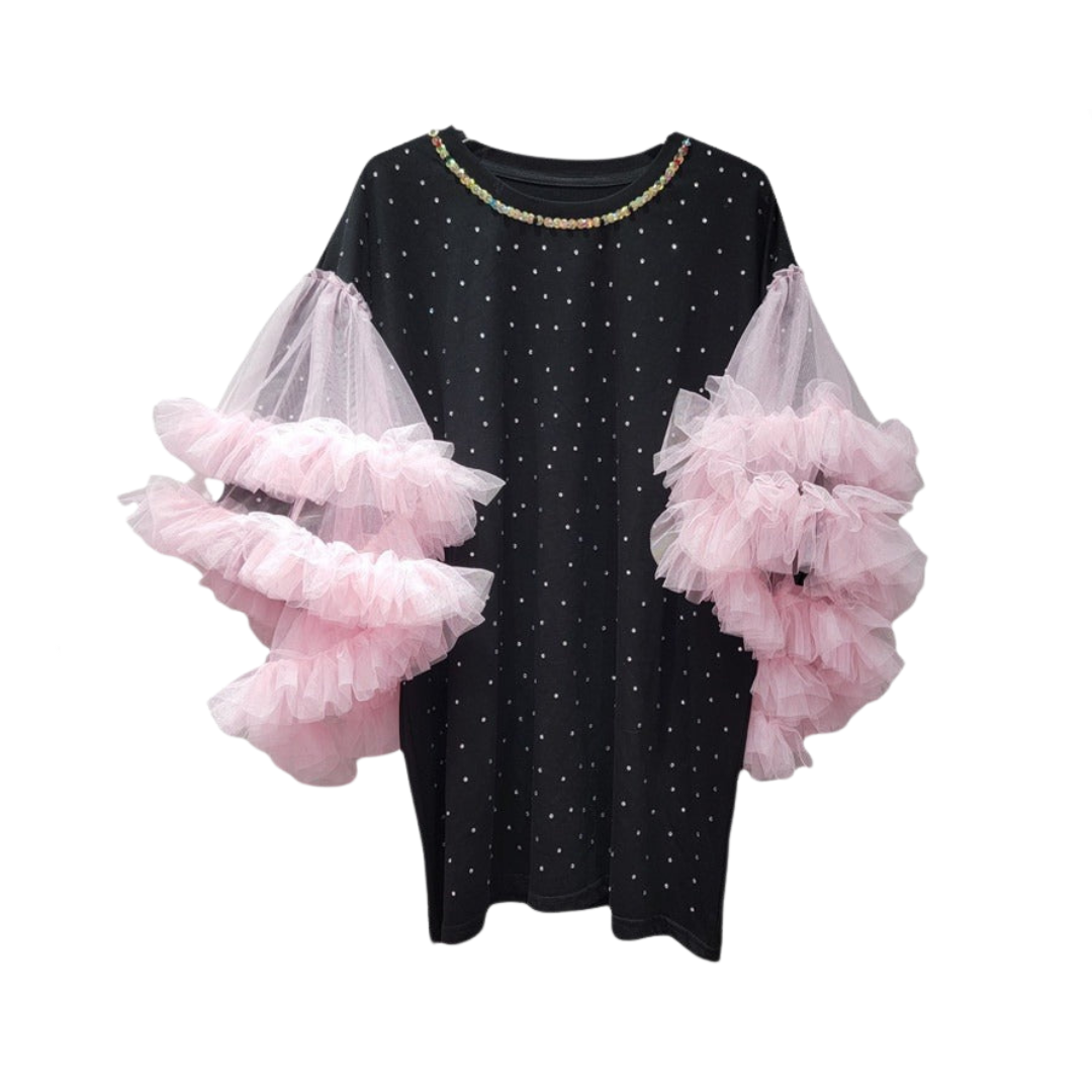 The double-layer lace sleeves add a delicate touch. while the diamond studs bring a subtle sparkle. With its loose fit. this t-shirt is perfect for any occasion and will elevate any outfit.