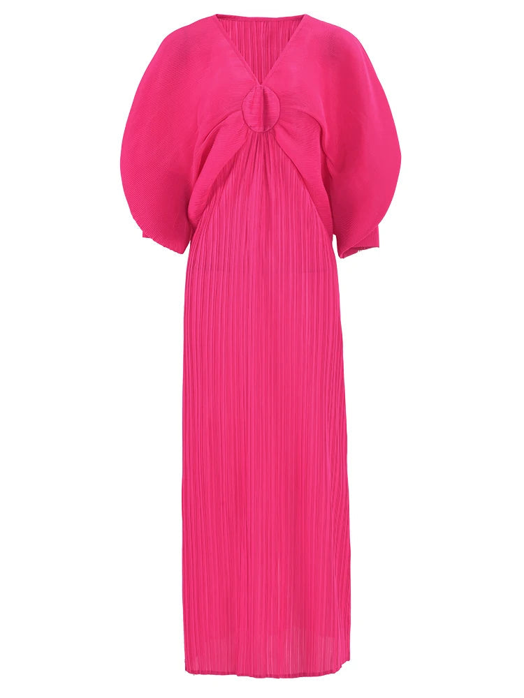 This elegant Dress Bat Sleeves V-Neck Long Dress exudes sophistication and style. Crafted with unique bat sleeves and a flattering v-neck design. this dress promises a comfortable and chic fit.