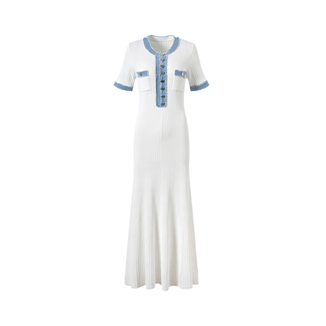 This dress offers a sleek. form-fitting silhouette with a comfortable elastic waistline. The classic round neck and button-up design add timeless appeal to this versatile maxi dress. making it perfect for any occasion.