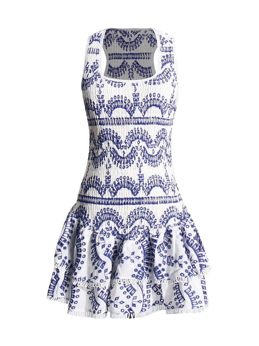 This stylish mini dress features an elastic waist for a comfortable. flattering fit. The pleated and ruffled design adds a touch of femininity to the dress. making it perfect for any occasion.