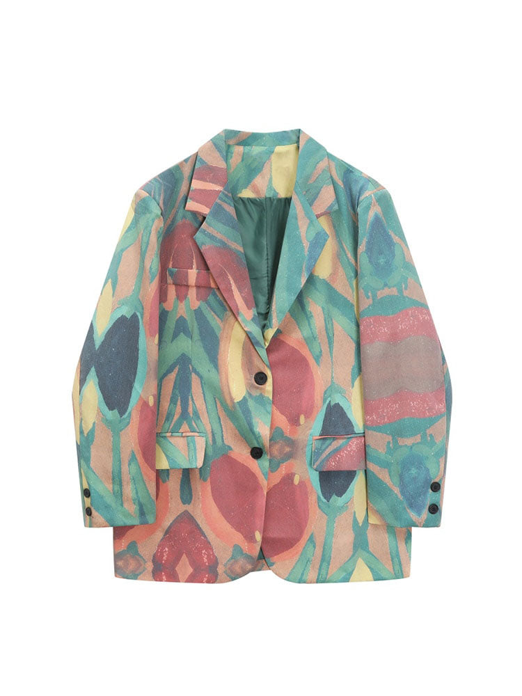 This jacket features a unique color graffiti print. adding a fashionable edge to your wardrobe. The loose. V-neck design and long sleeves provide comfort and versatility. perfect for any occasion.
