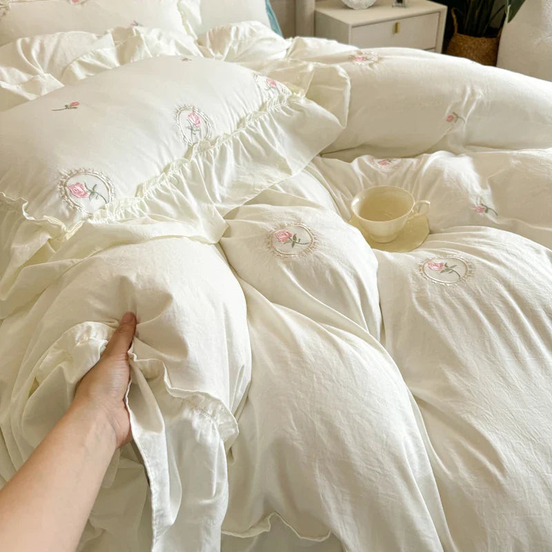 Elegant Rose Embroidery Lace Ruffles Bedding Set Skin-friendly Washed Cotton Princess Wedding Duvet Cover Bed Sheet Pillowcases