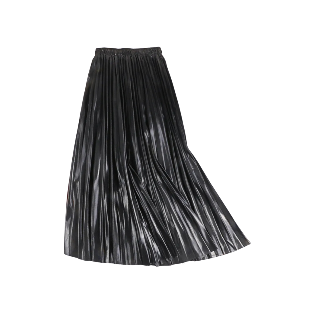 This midi skirt features a high waist for a flattering fit and comes in black. silver. and gold solid colors. The pleated design adds a touch of elegance to any outfit.