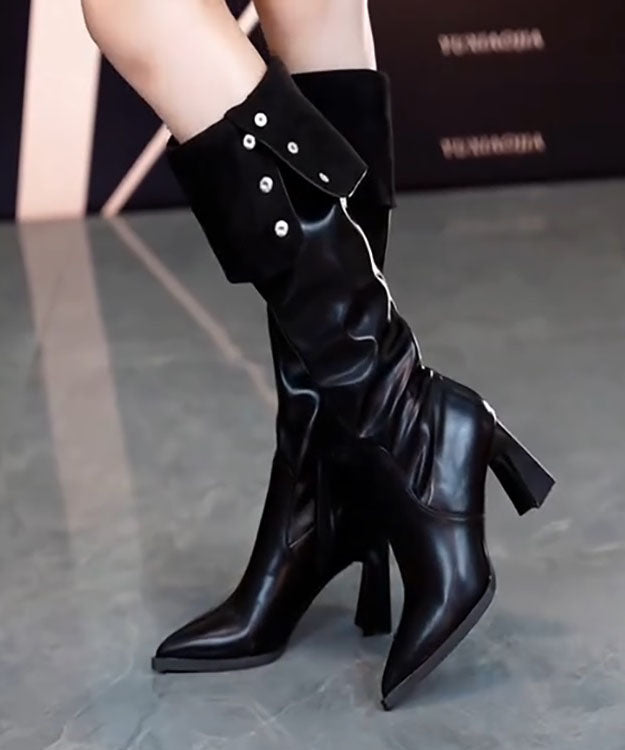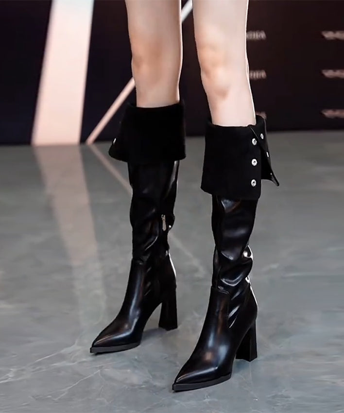 Fashion Beige Boots Chunky Heels Faux Leather Fuzzy Wool Lined