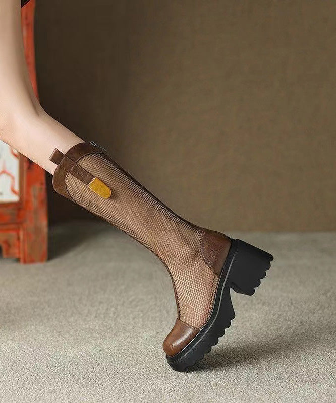 Fashion Breathable Tulle Splicing Chunky Boots Black Cowhide Leather