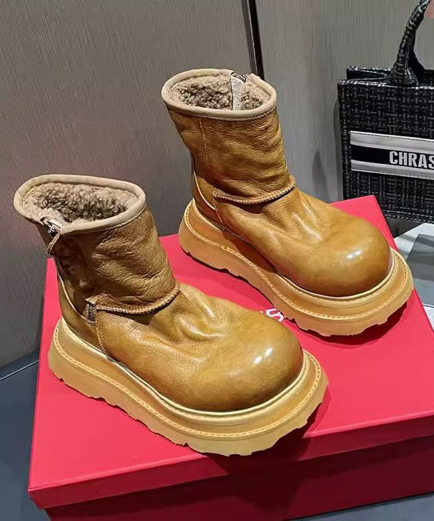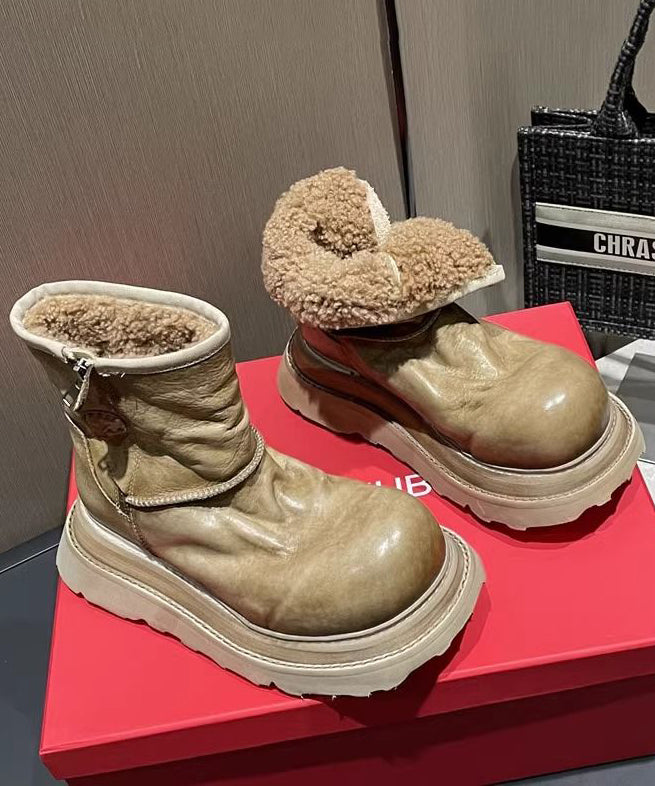 Fashion Caramel Faux Leather Boots Fuzzy Wool Lined Splicing Zippered