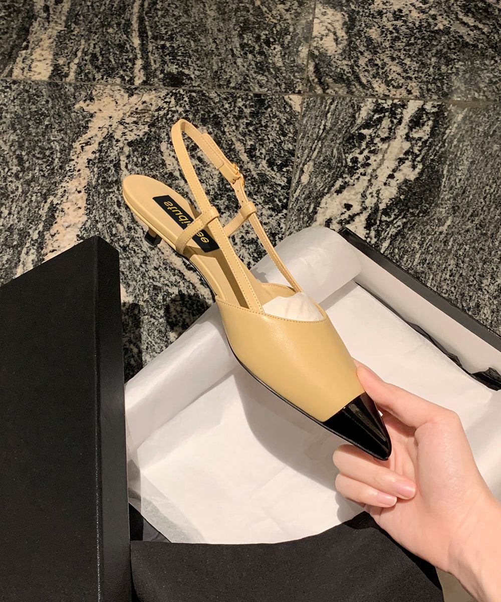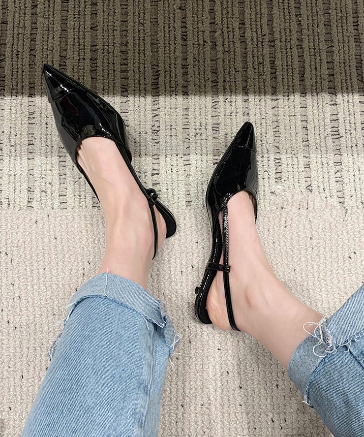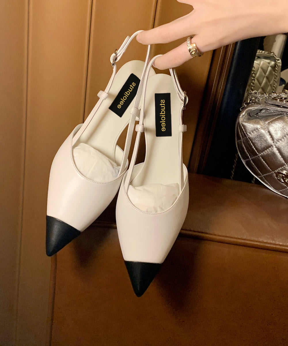 Fashion Kitten Sandals Black Cowhide Leather Hollow Out Pointed Toe