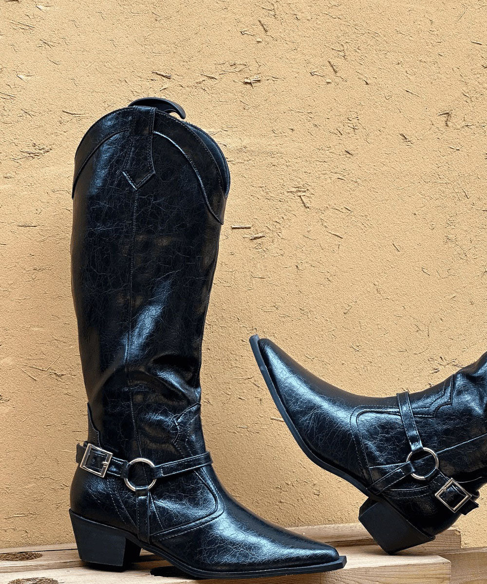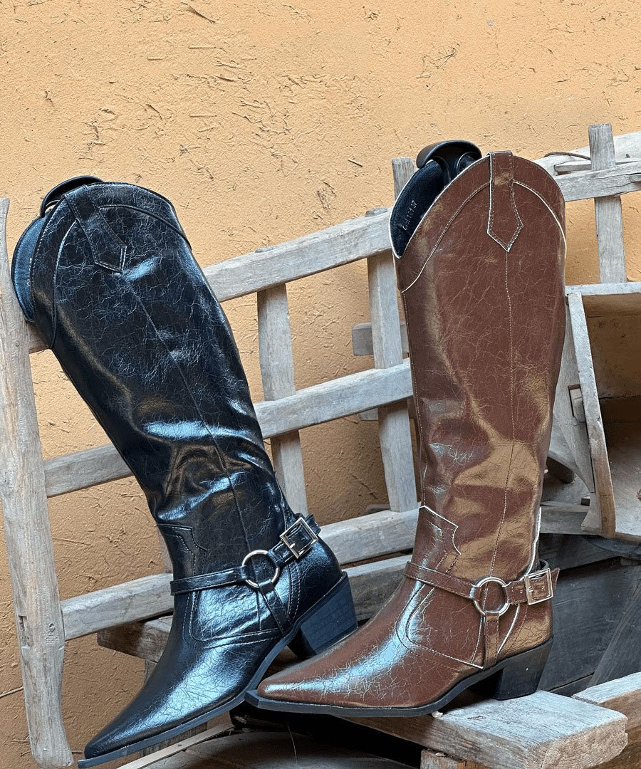 Fashion Splicing Chunky Boots Brown Faux Leather Pointed Toe